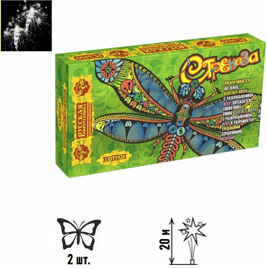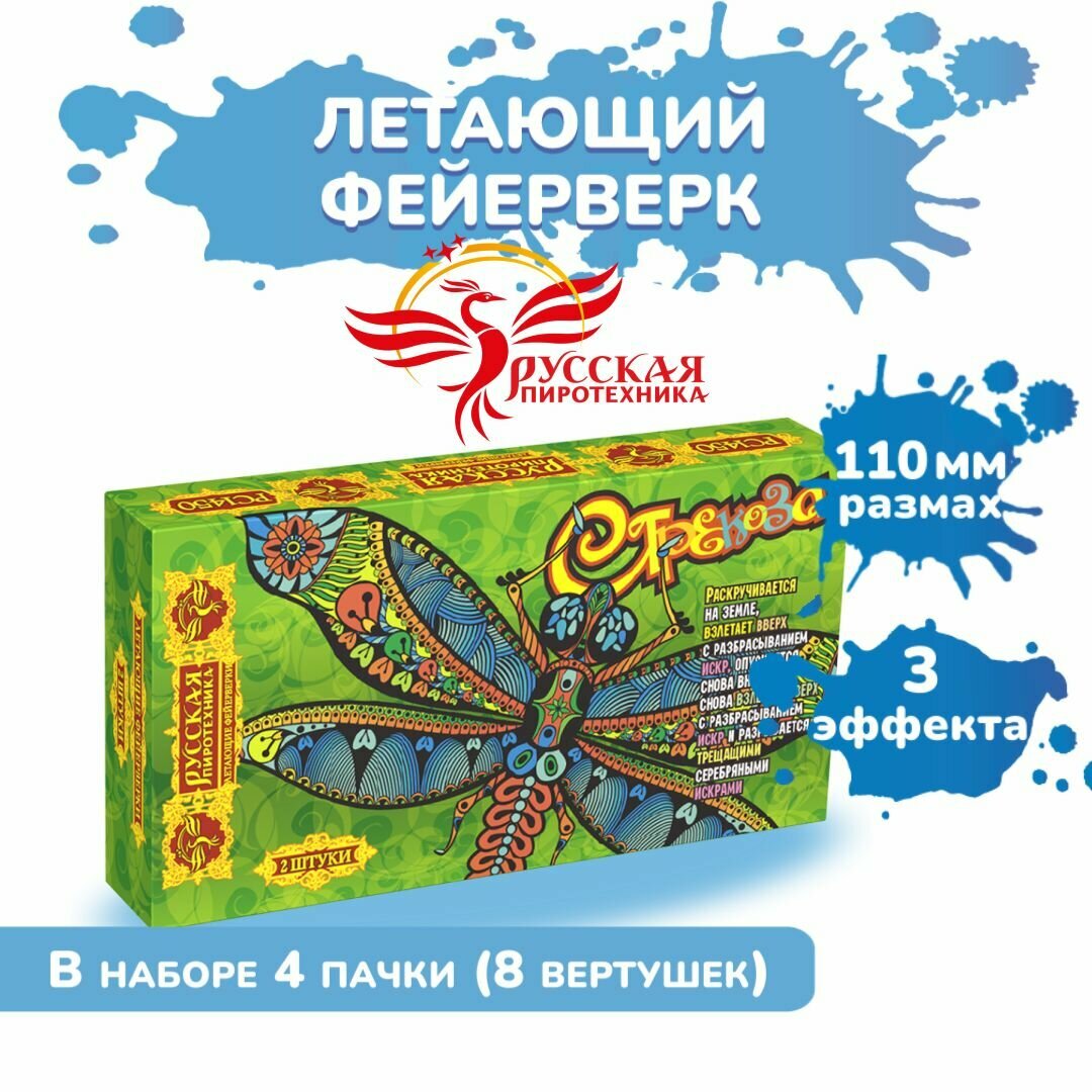 | Комплектация | Летающий фейерверк Стрекоза-Русская Пиротехника PC1450 ( 2 шт. в заводской упаковке.) |
