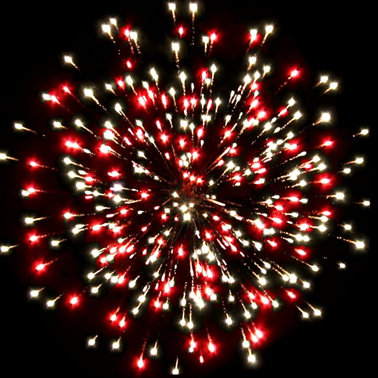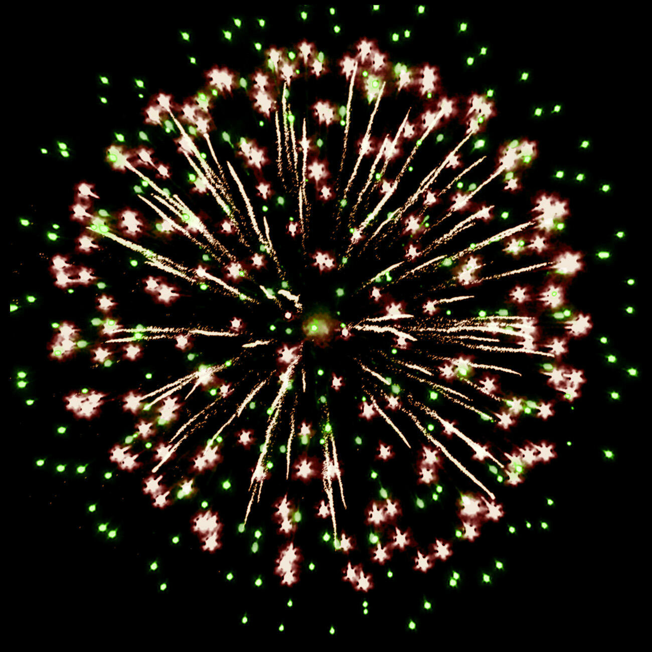 | Эффекты | 1. Разноцветные кометы / искристые трассы разрываются сферами из: серебряных мерцающих и красных огней с форсами. 2. Золотые трещащие разлетающихся искры и красные / зелёные огни с форсами. 3. Золотых форсы. 4. Красные огни с форсами и множеством трещащих сфер (залп). |