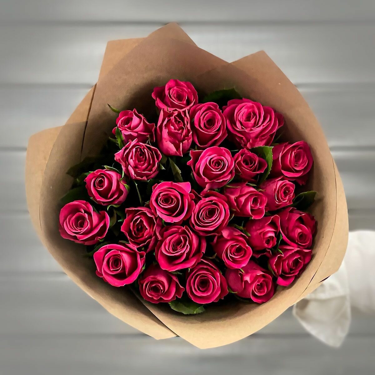 Купить Букет живых цветов из 19 малиновых роз 40см в крафте