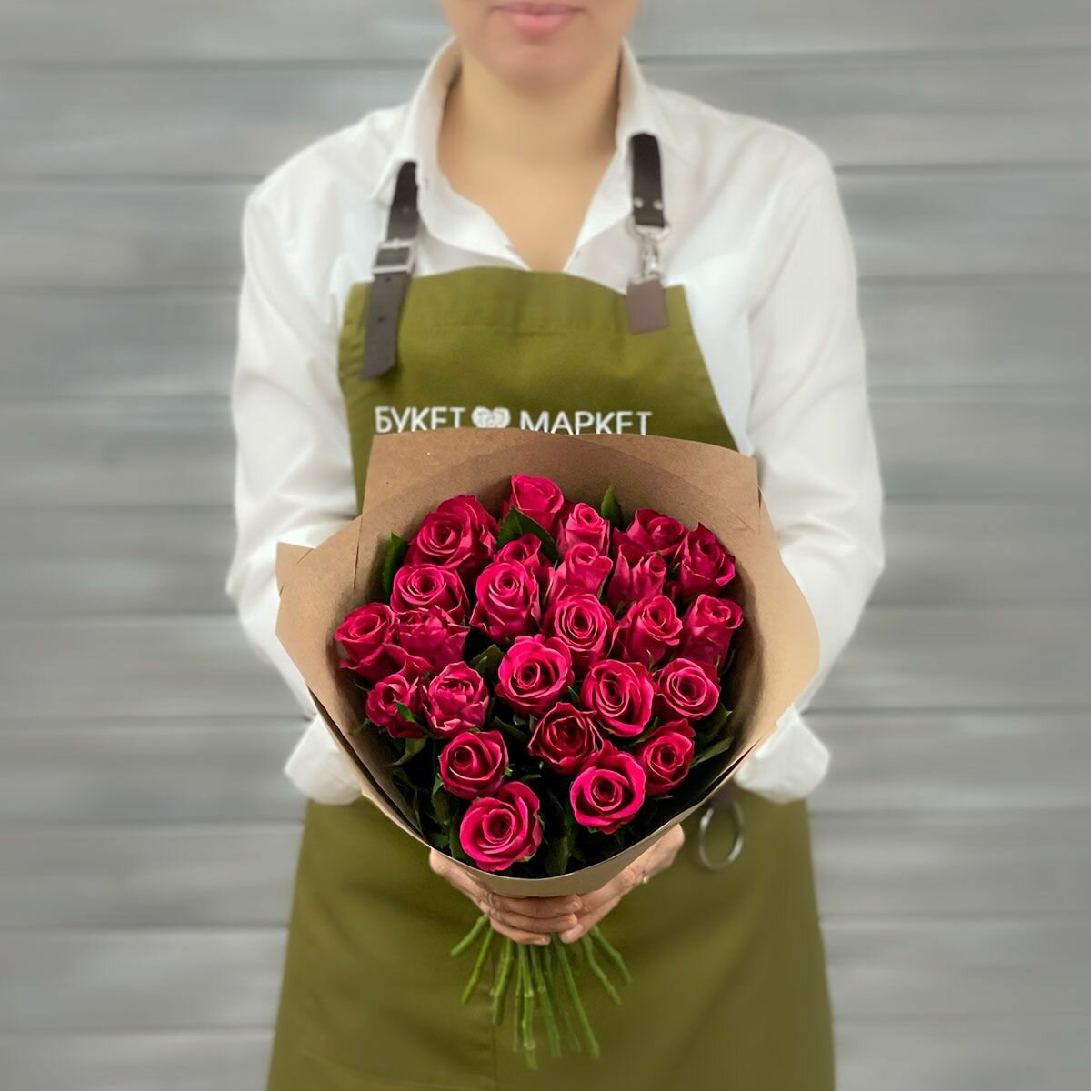 Букет живых цветов из 25 малиновых роз 40см в крафте