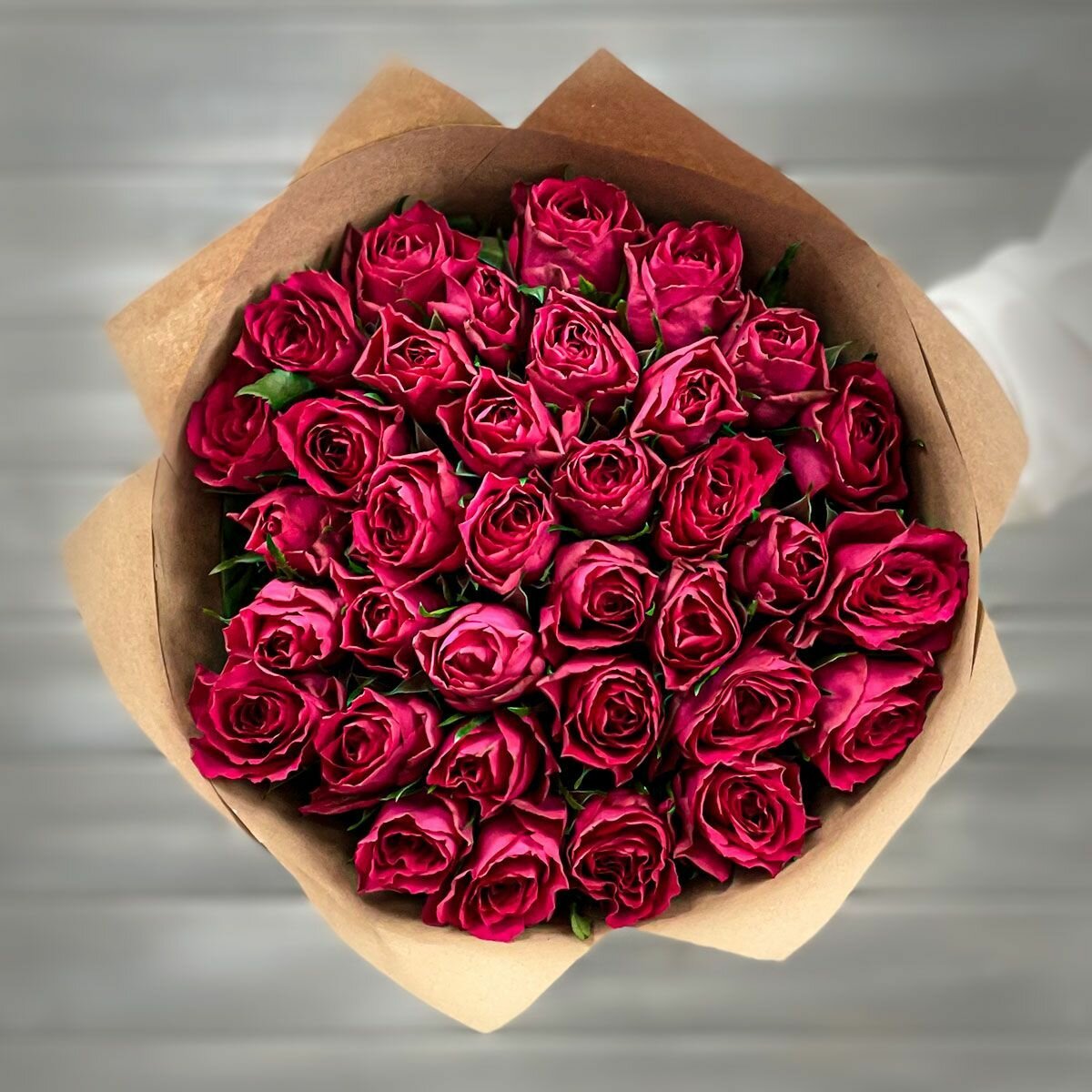 Букет живых цветов из 33 малиновых роз 40см в крафте