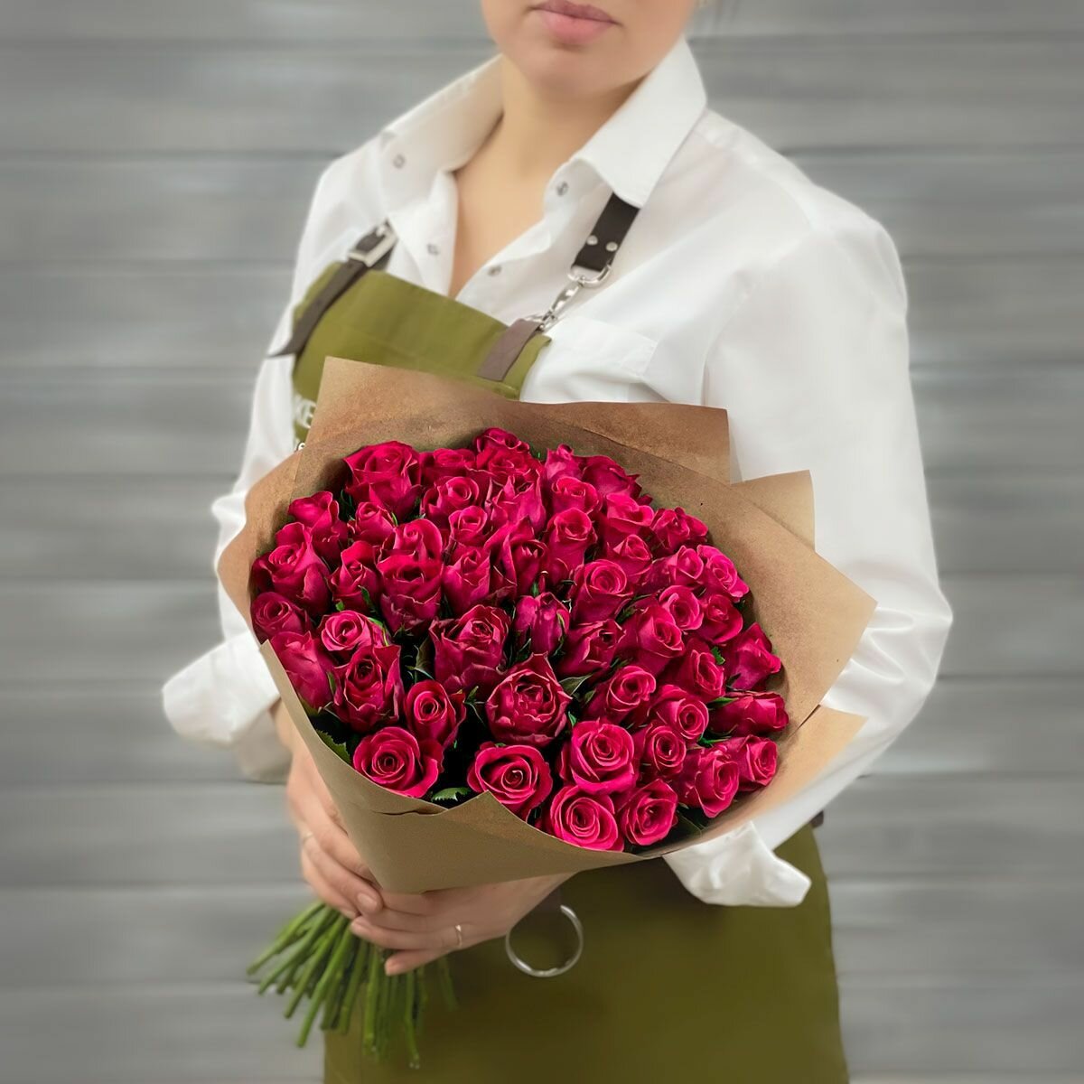 Купить Букет живых цветов из 51 малиновой розы 40см в крафте