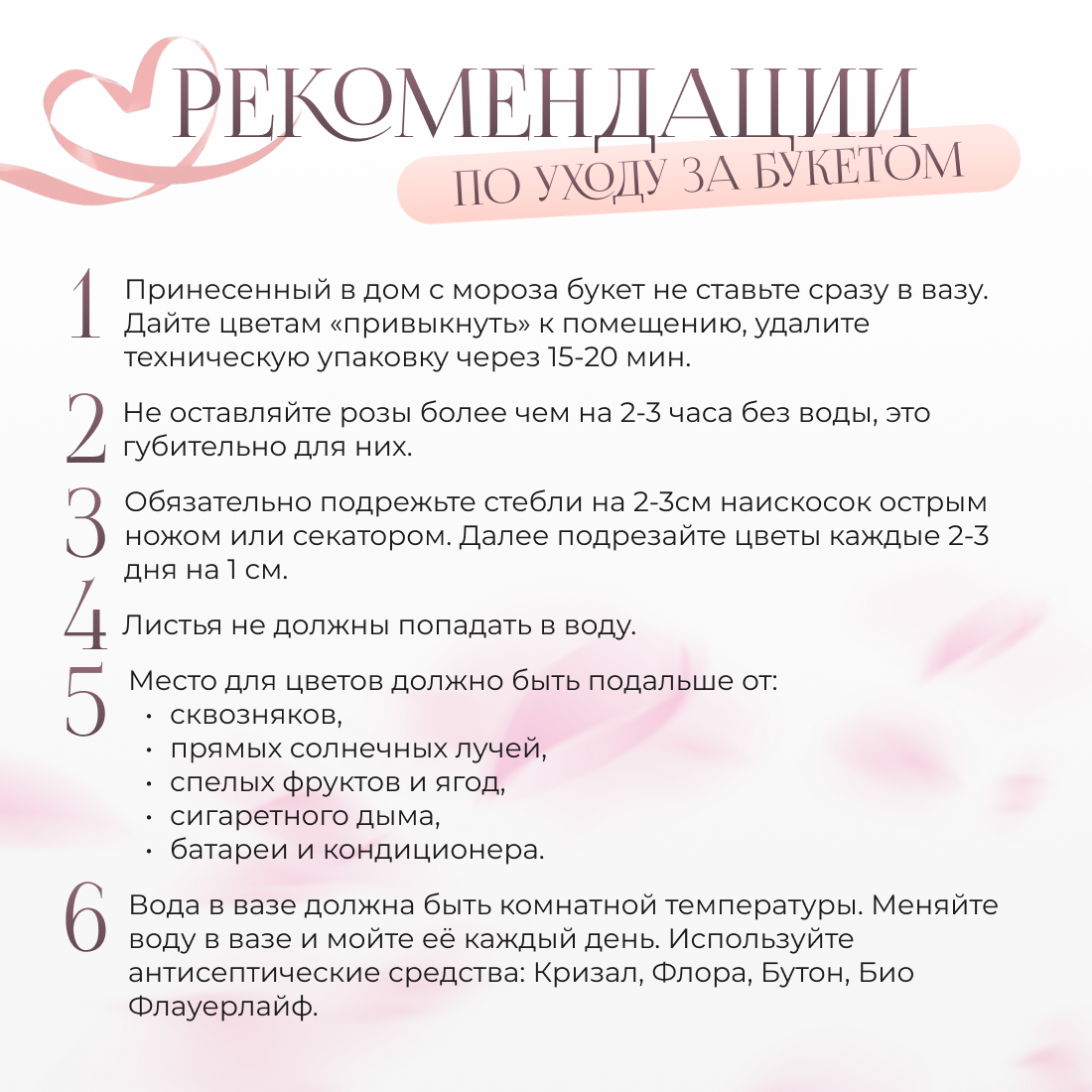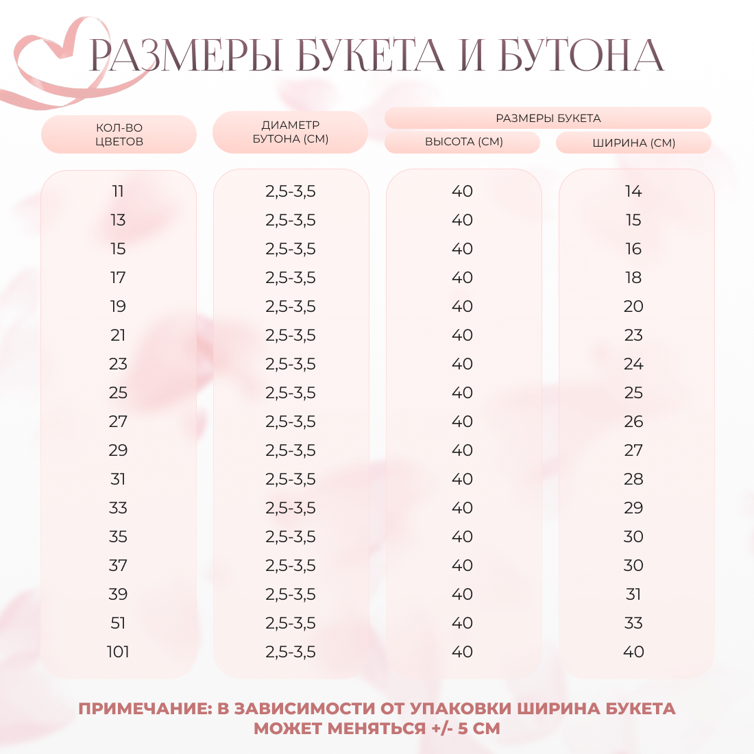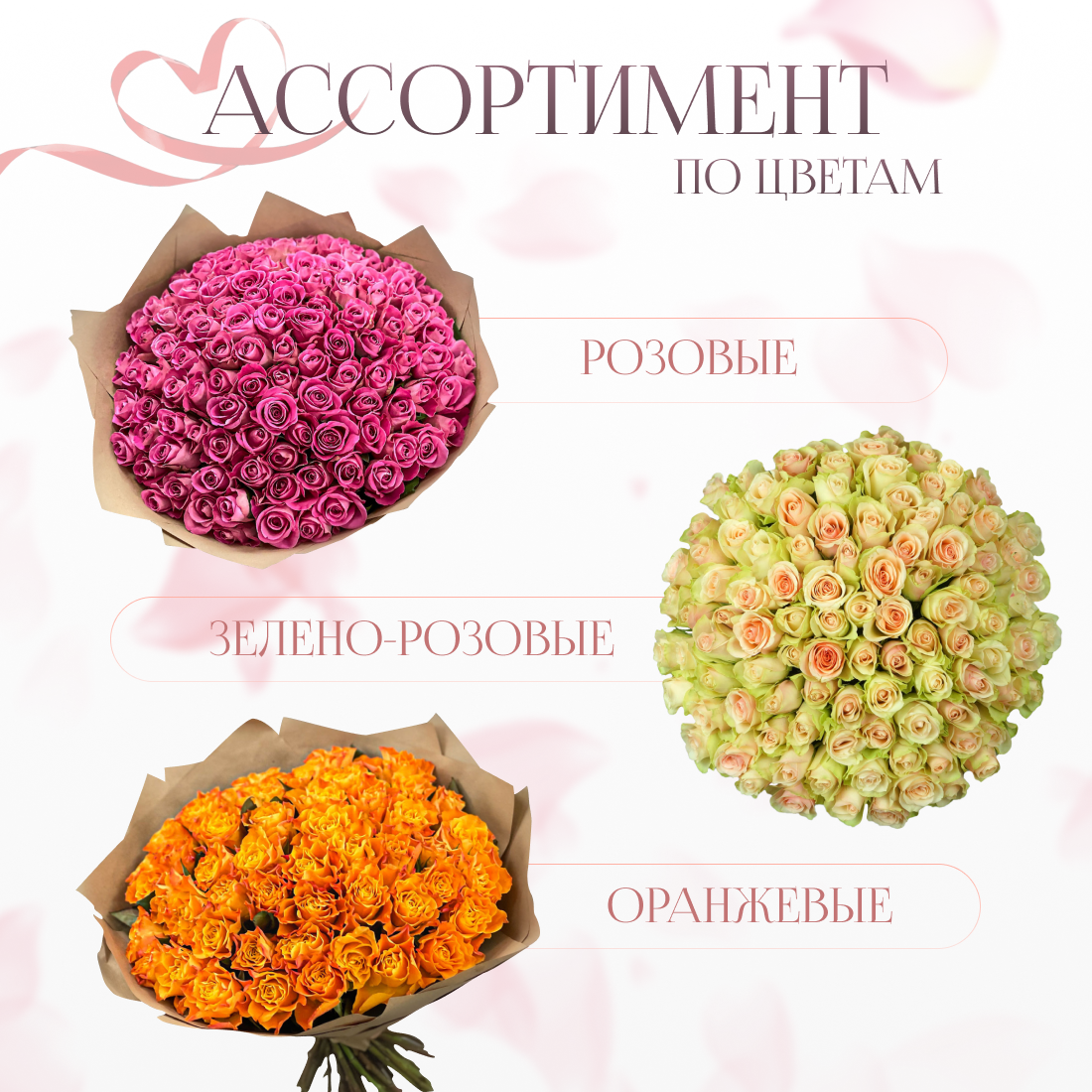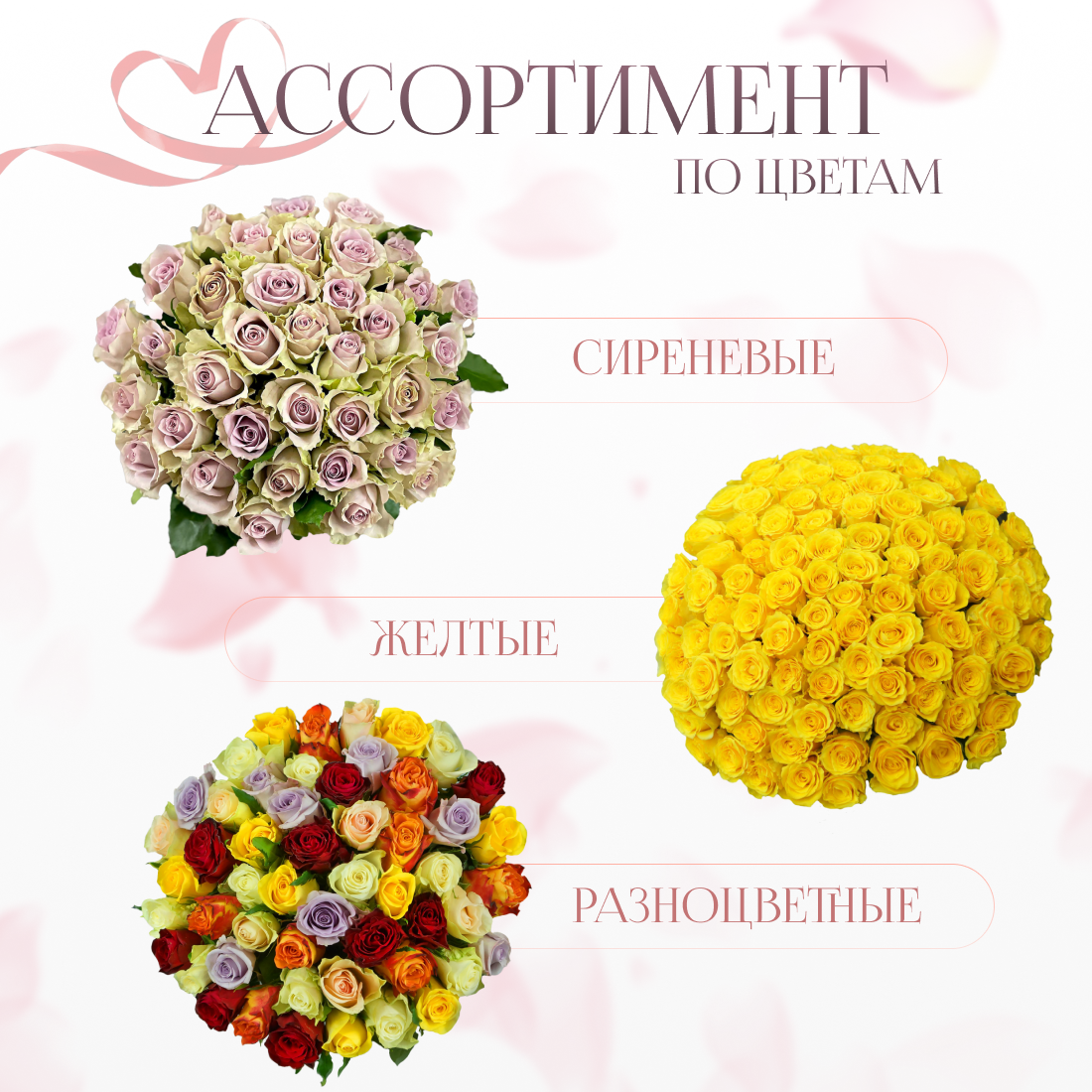 | Дополнительная информация | Приведённые фото букетов являются возможными вариантами изготовления цветочных композиций. Каждая изготавливаемая флористом цветочная композиция является уникальной и может отличаться внешним видом, размером и оттенками цвета. Также возможны замены по ассортименту и составу цветов в зависимости от сезонности, наличия цветов и т.п. факторов. Итоговое исполнение Заказа может незначительно отличаться от иллюстрации на Сайте. При этом каждая цветочная композиция составляется из свежих цветов, и флористы предпринимают все усилия для того, чтобы цвет, форма цветочной работы как можно полнее соответствовали иллюстрации на фото. |