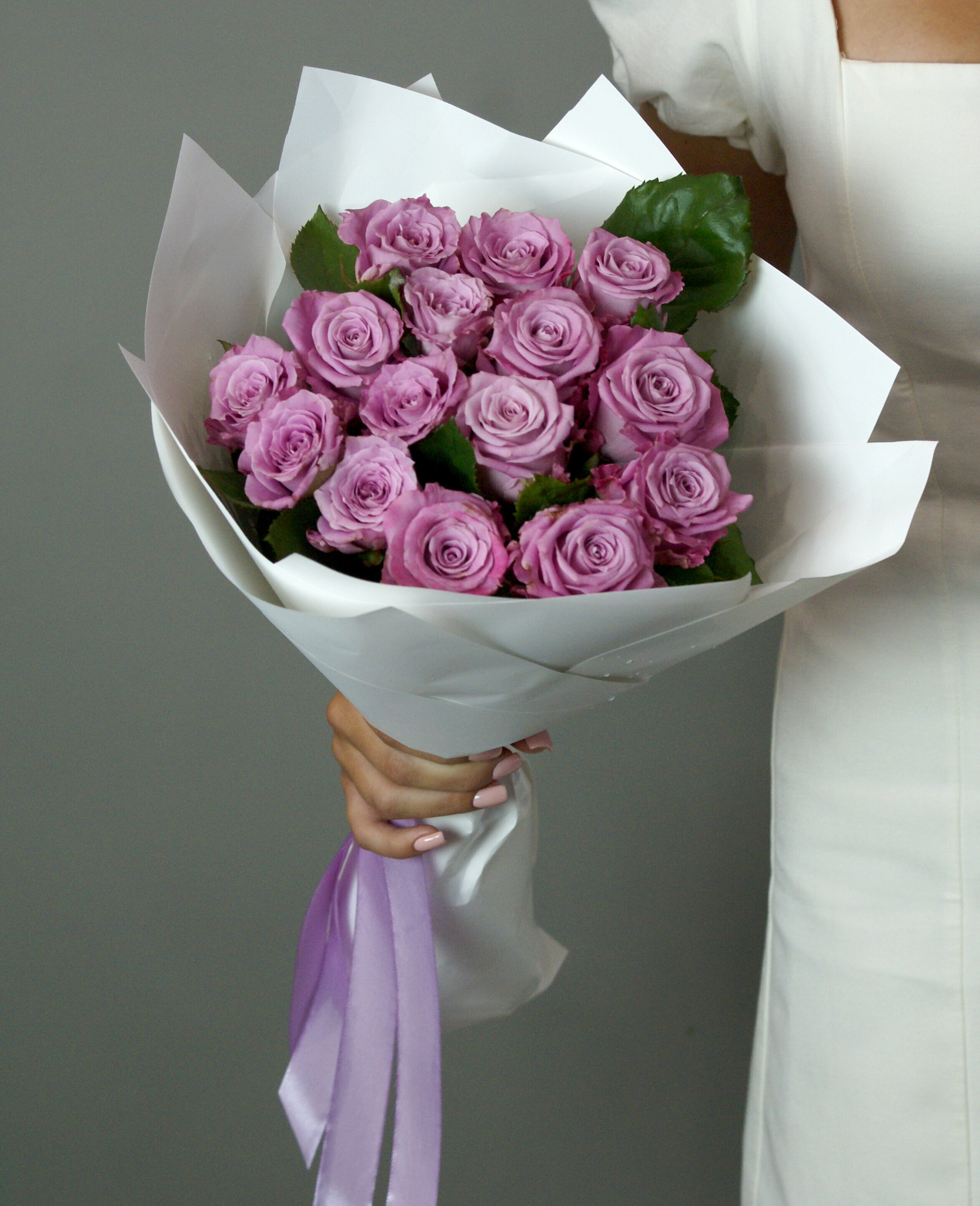 Букет роз фиолетовых 15 штук "Меритим" 43 см букет