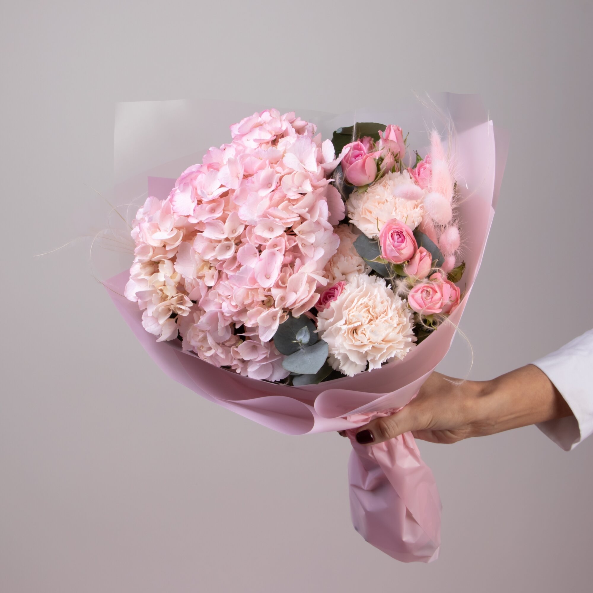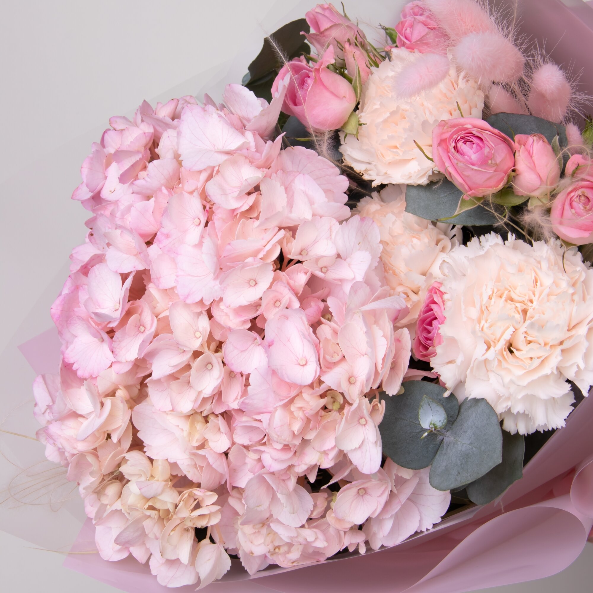 | Состав | Гвоздика-7;Гортензия-2;Роза-5;Роза кустовая-3;Лагурус-1;Листья фисташки-7;Листья эвкалипта-3;Стифа-1;Амарантус-1; |