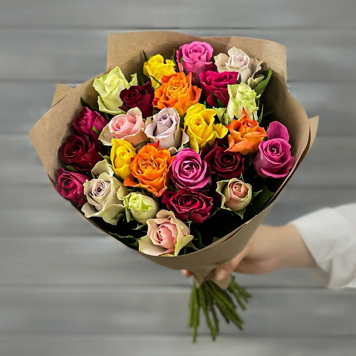 Букет живых цветов из 31 разноцветной розы 40см в крафте