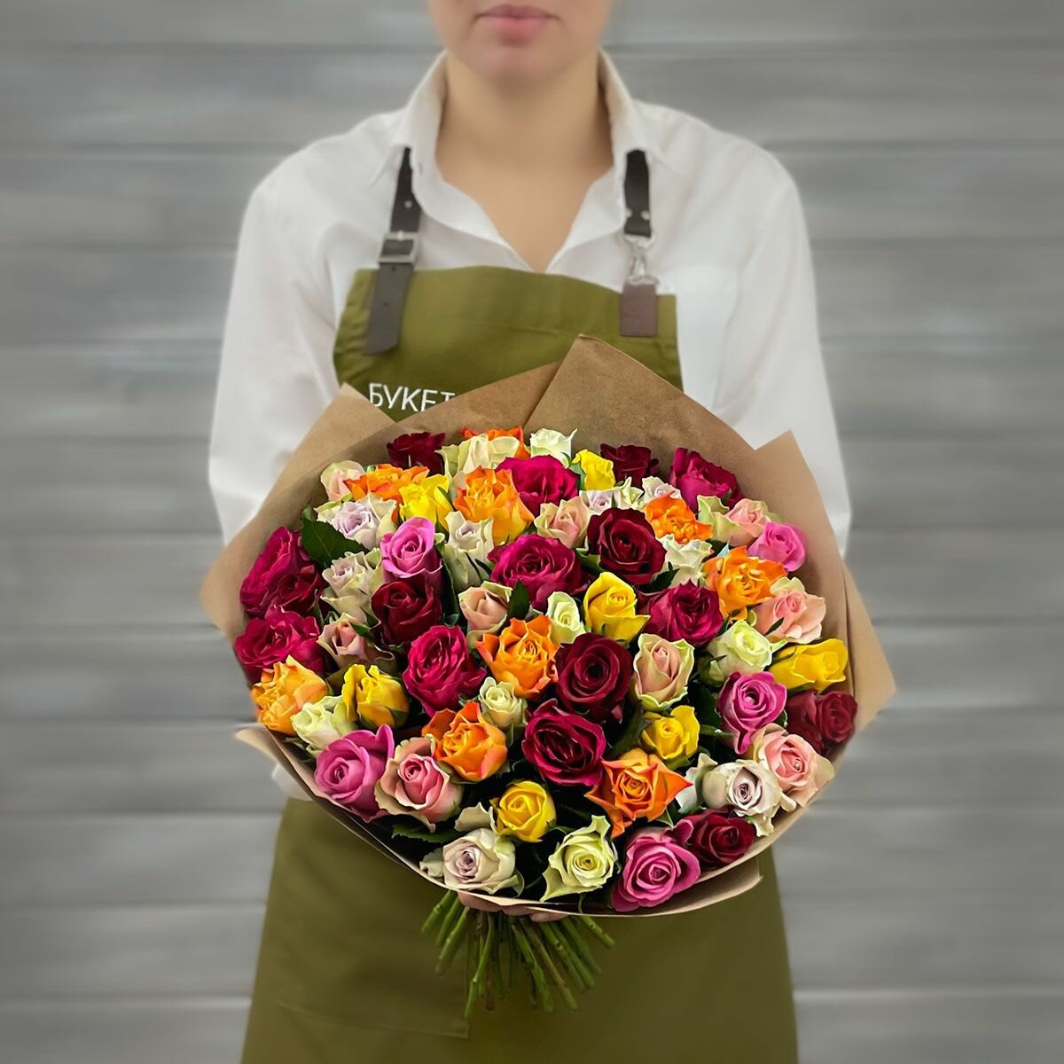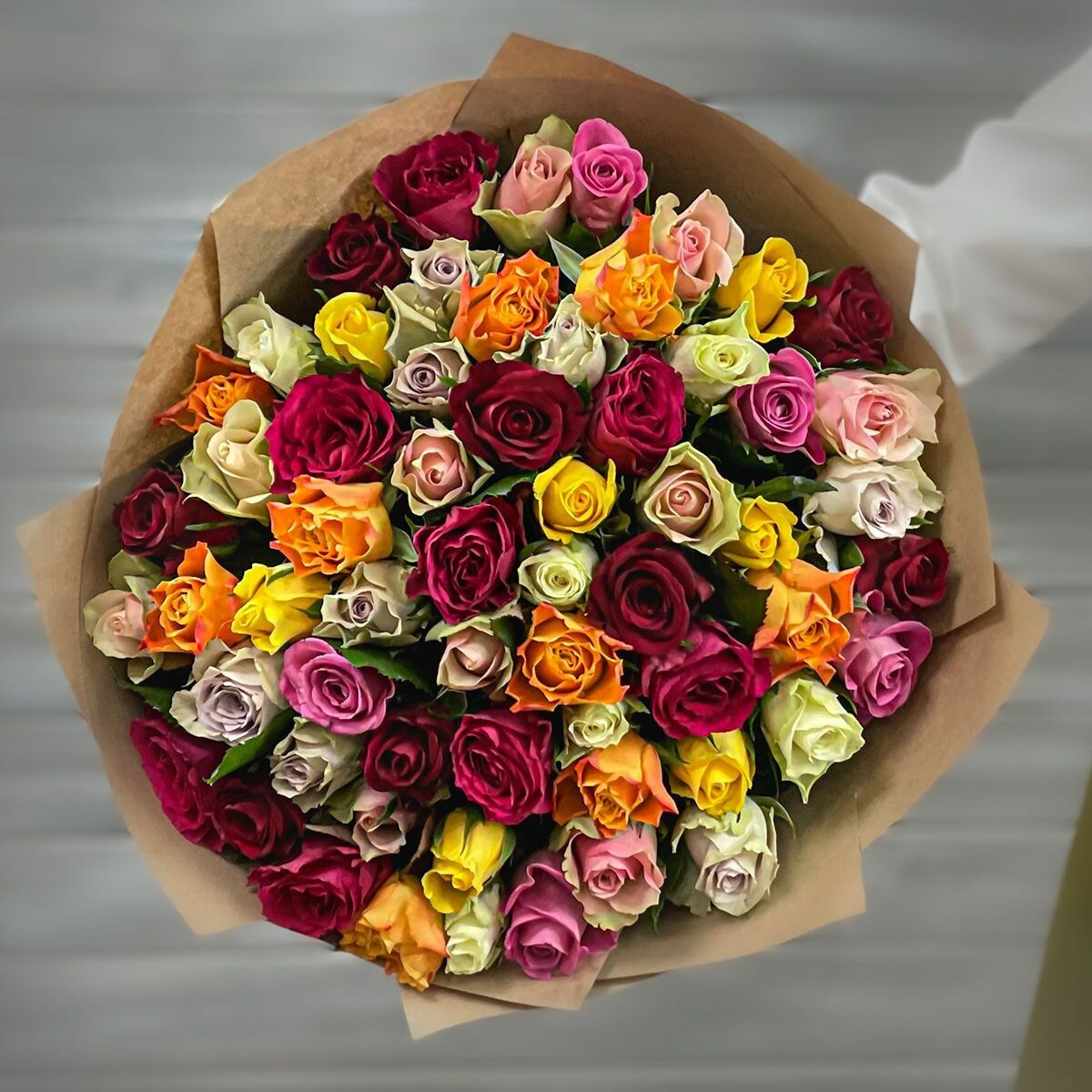 Букет живых цветов из 101 разноцветной розы 40см в крафте