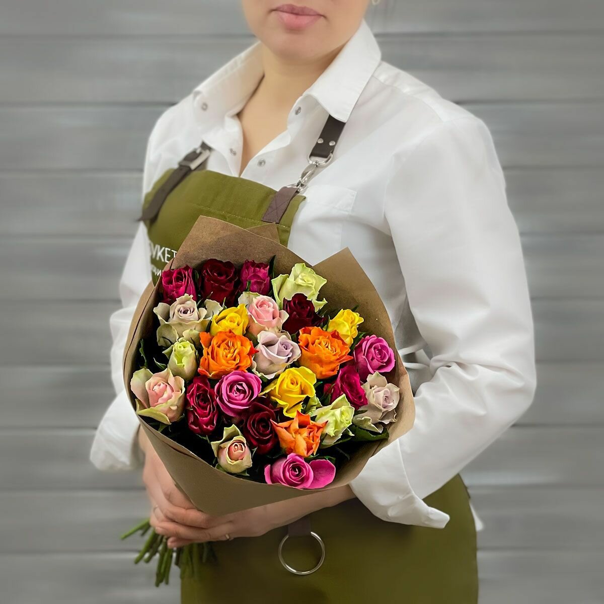 Букет живых цветов из 31 разноцветной розы 40см в крафте