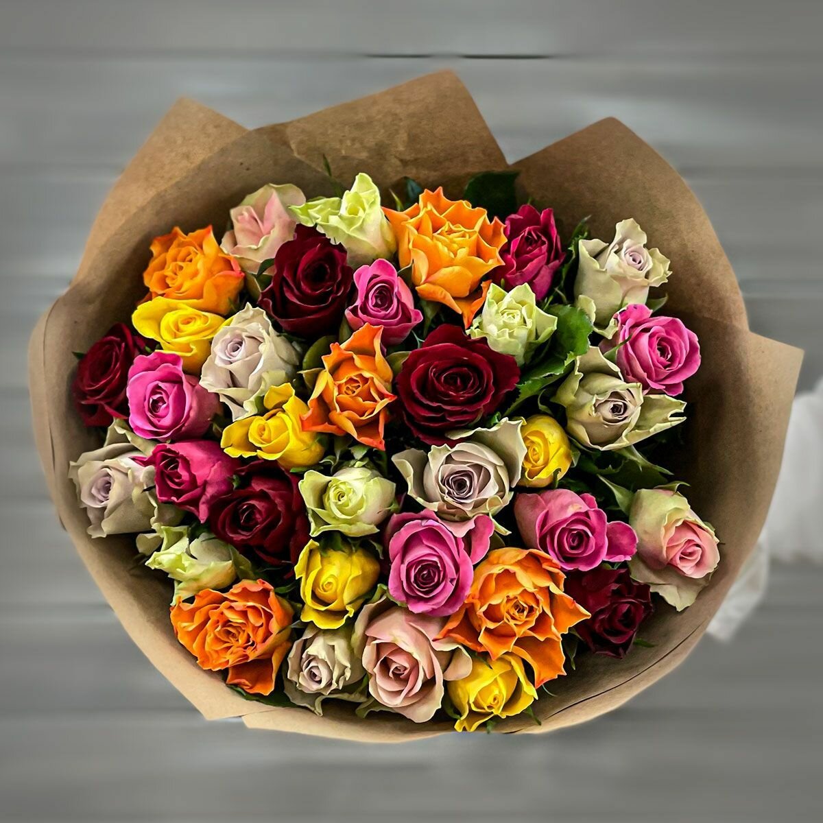 Купить Букет живых цветов из 29 разноцветных роз 40см в крафте