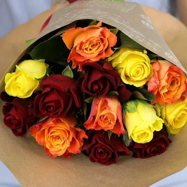 Букет живых цветов из 17 разноцветных роз 40см в крафте