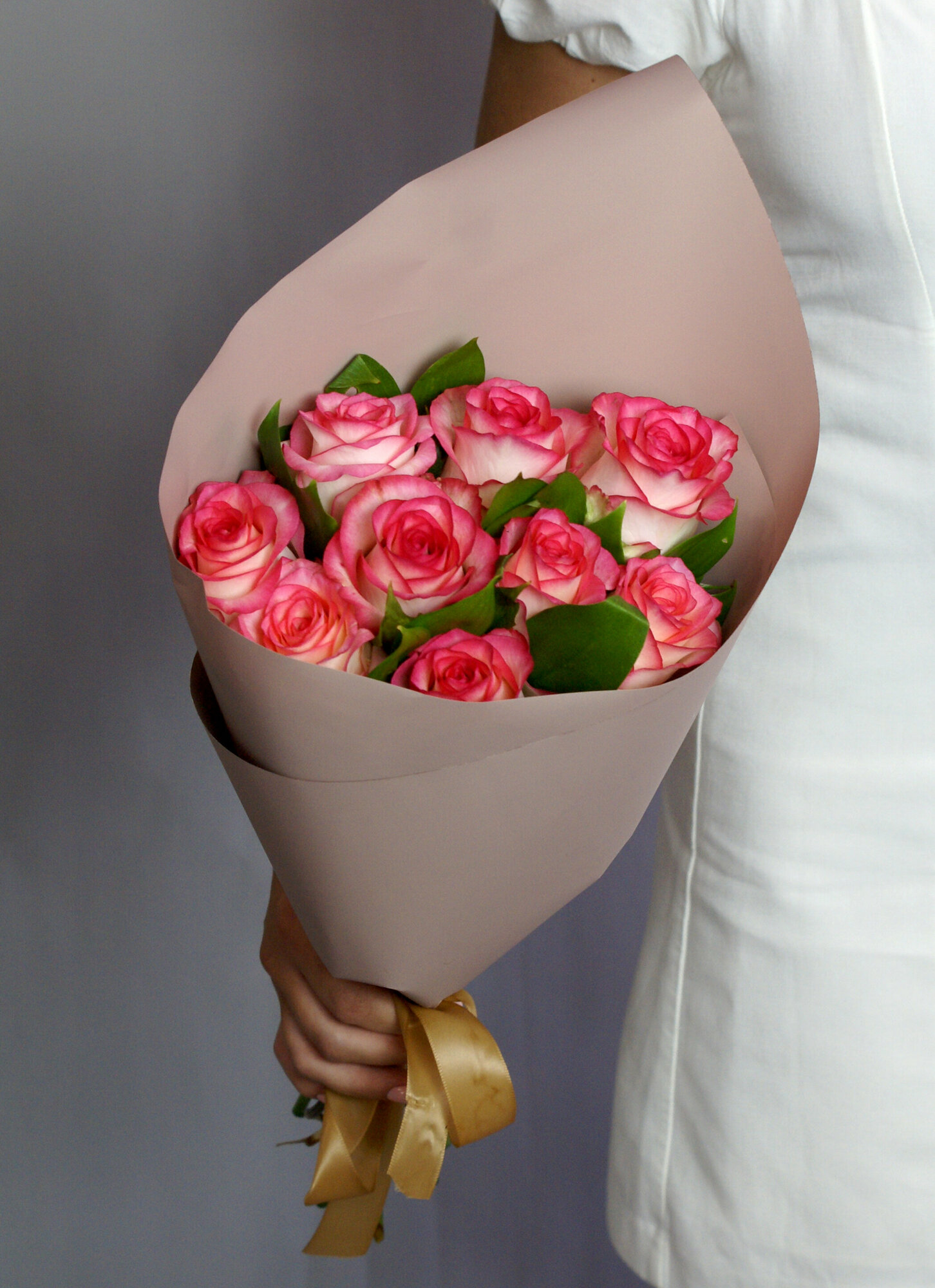 Букет из 9 розовых роз "Джумилия" с зеленью длина 45 см