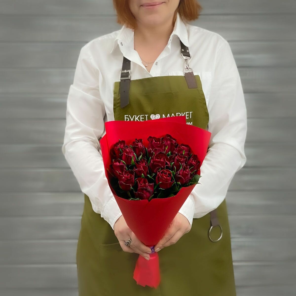 Букет из живых цветов 21 красной розы в упаковке 40см