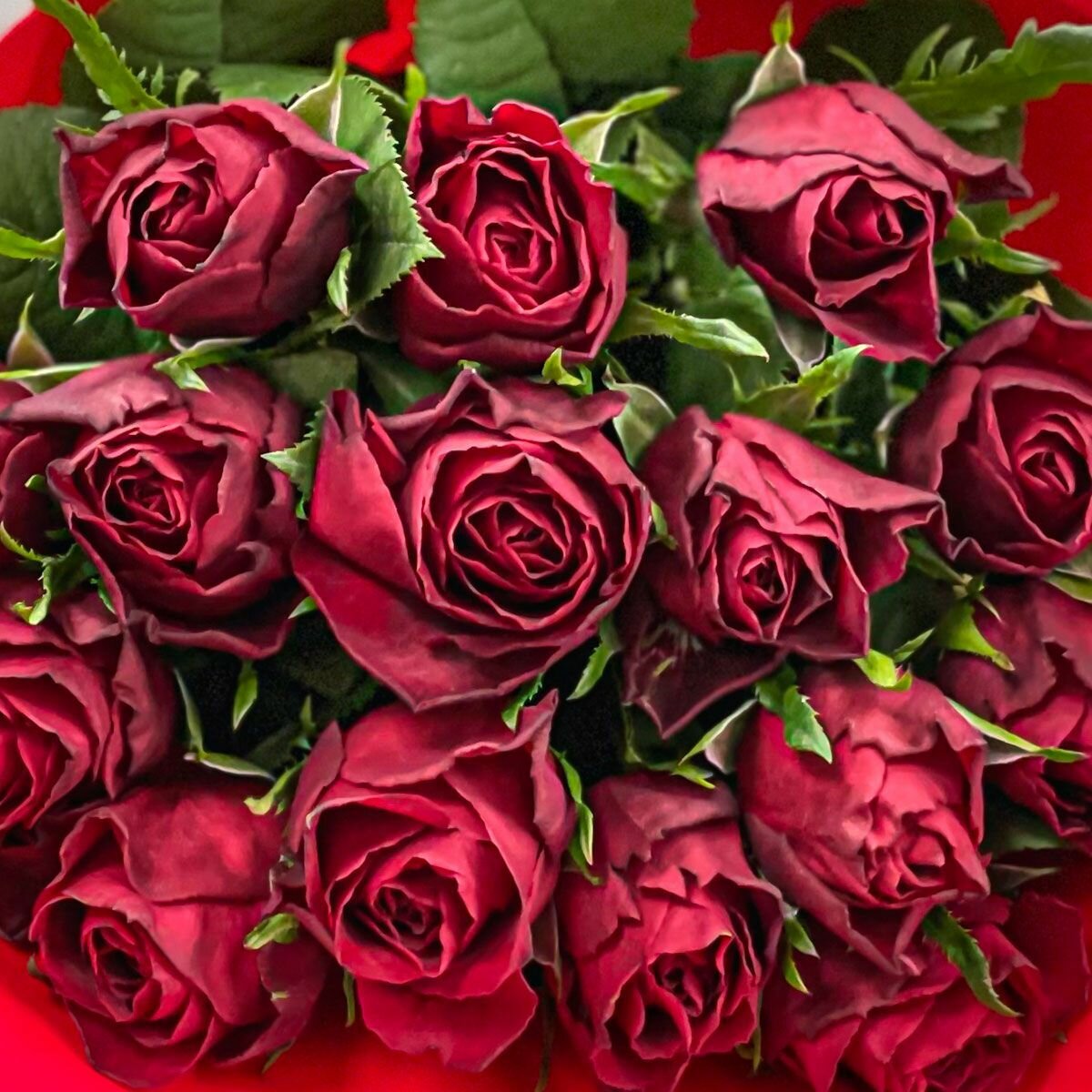 Букет живых цветов из 25 красных роз в упаковке 40см