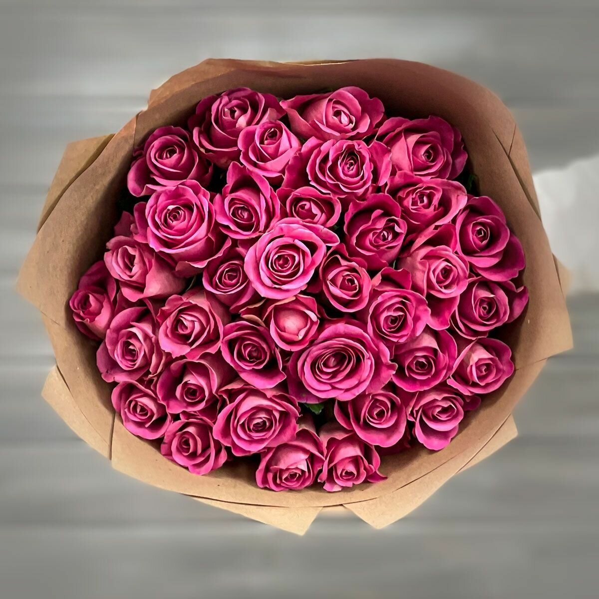 Букет живых цветов из 35 розовых роз 40см в крафте