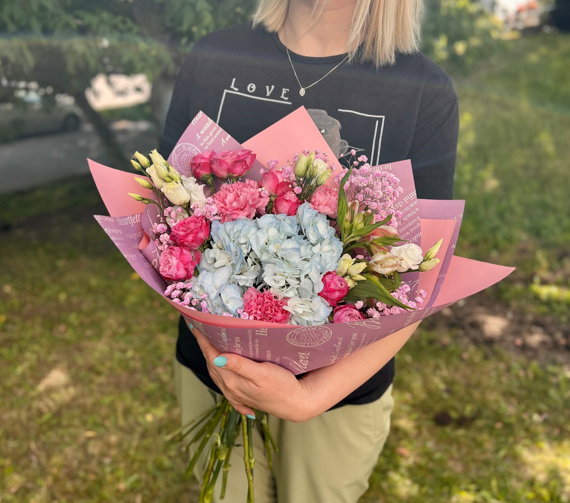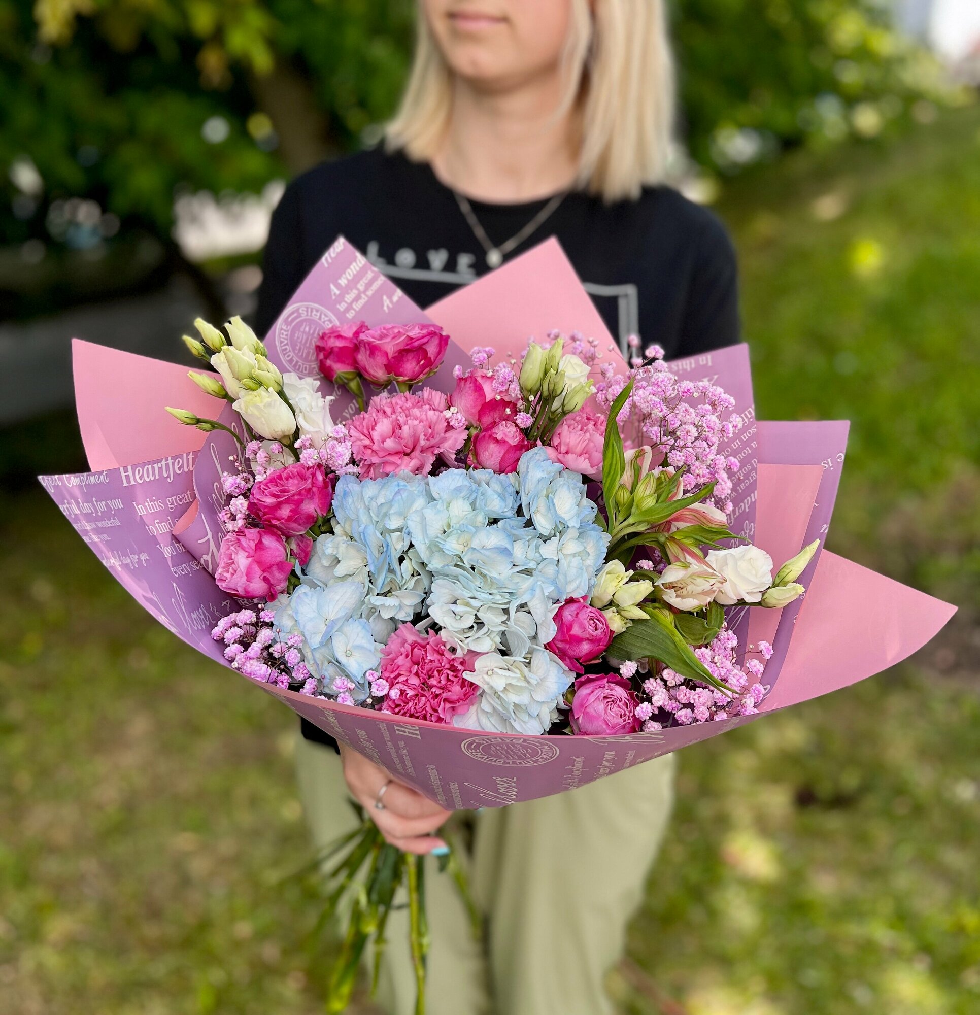 | Вид цветов | альстромерия / гвоздика / гипсофила / гортензия / роза кустовая / эустома |
