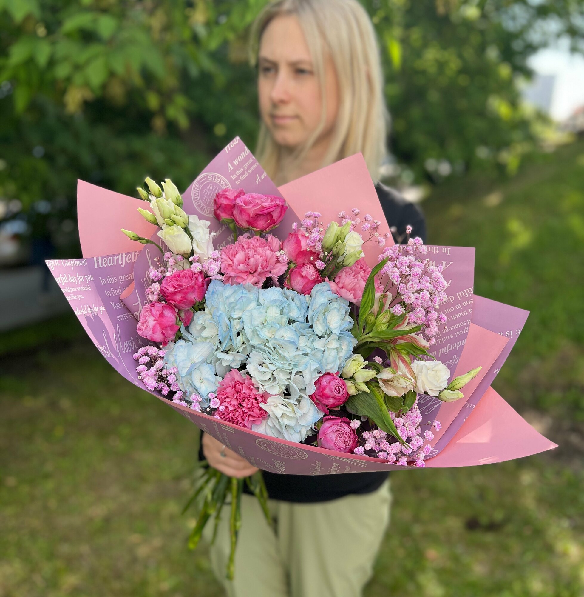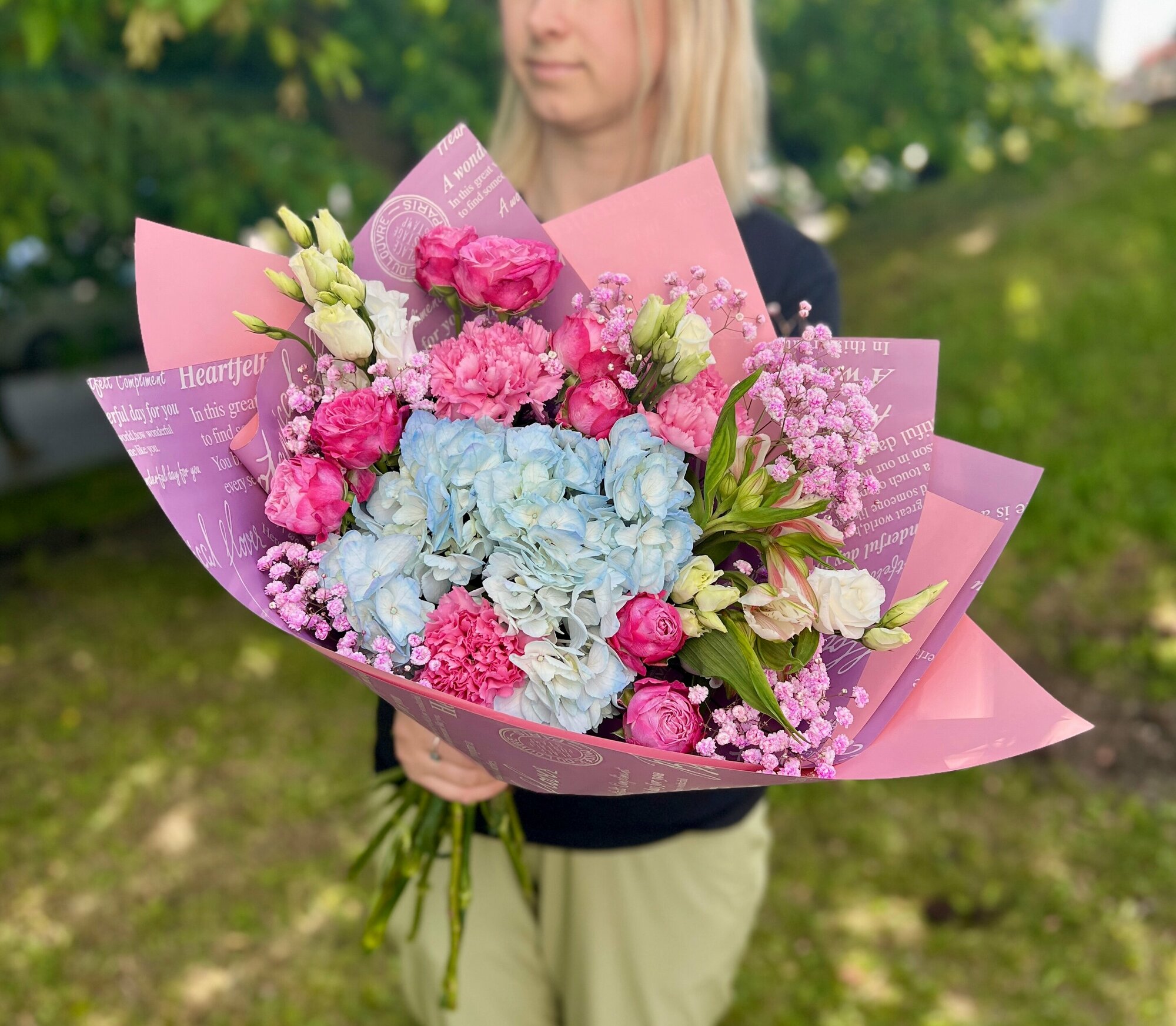 | Состав | гвоздика-3шт., роза кустовая-2шт., гипсофила-1шт., альстромерия-2шт., гортензия-1шт., эустома-2шт., упаковка дизайнерская-2шт. |