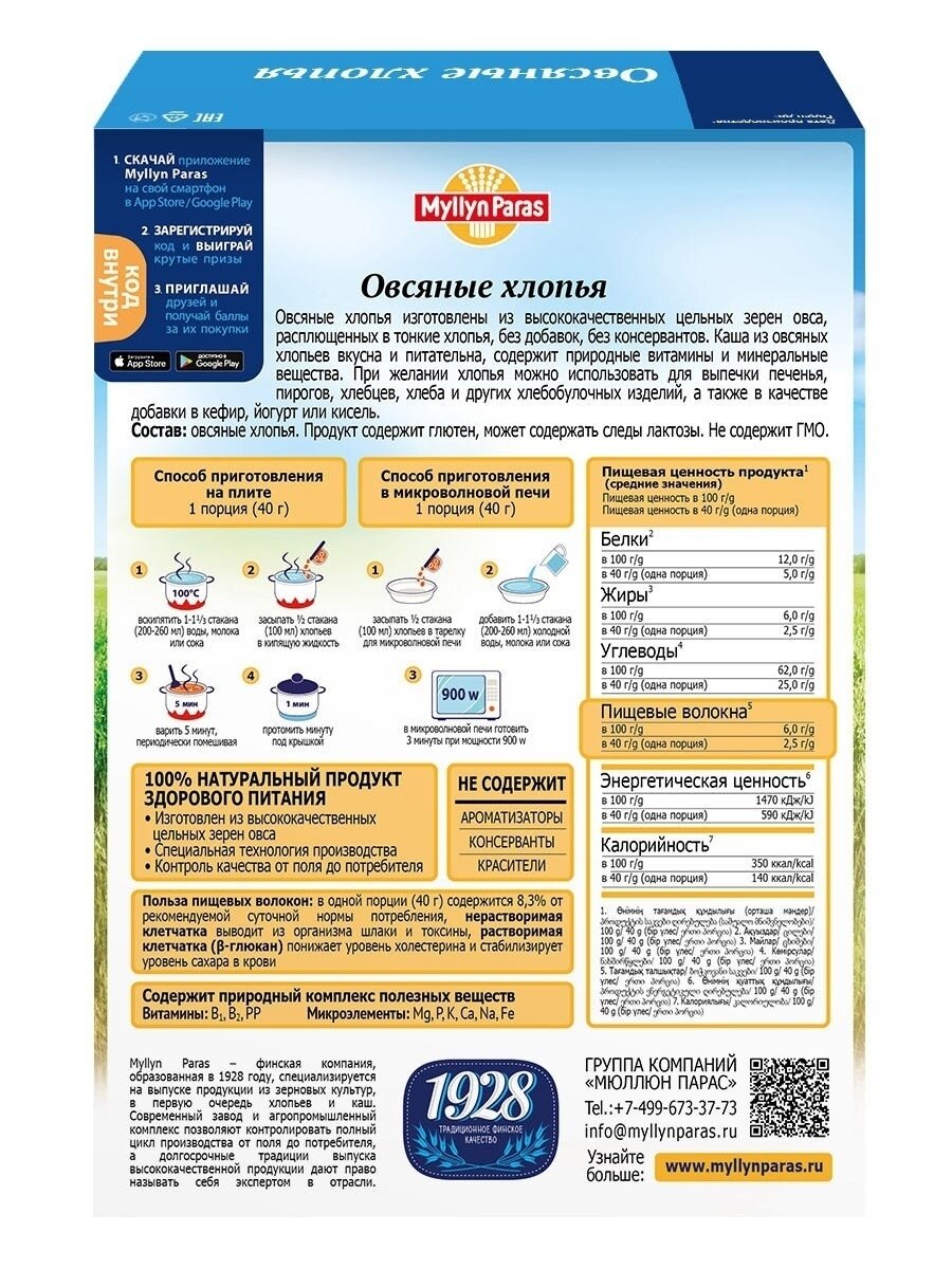 Хлопья MYLLYN PARAS 1928 (МП12) Овсянные 500г интересное: