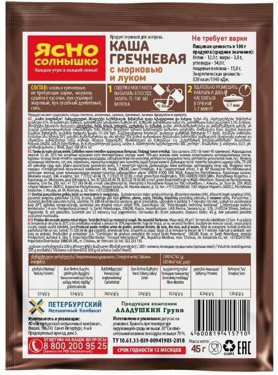 | Состав | Каша гречневая с паприкой, томатом и зеленым луком: хлопья гречневые, не требующие варки, паприка сушеная (кусочки и молотая), соль, лук зеленый сушеный, томаты сушеные молотые. Каша гречневая с грибами и жареным луком: хлопья гречневые, не требующие варки, кусочки грибов шампиньонов, сушенных сублимационной сушкой, лук сушеный жареный. Каша гречневая с морковью и луком: хлопья гречневые, не требующие варки, морковь сушеная кусочки, лук сушеный жареный, лук сушеный дробленый, соль. |