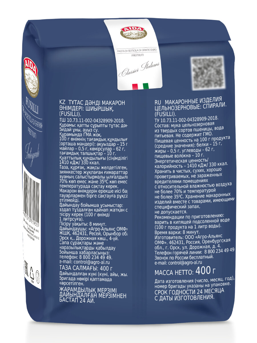 Макаронные изделия AIDA цельнозерновые Fusilli/Спирали 400г интересное: