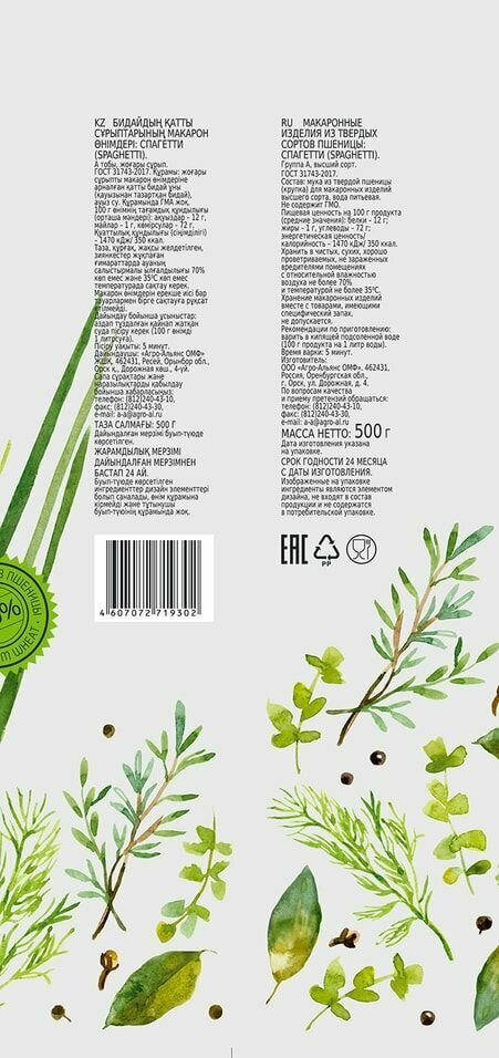 | Состав | мука из твердой пшеницы (крупка) для макаронных изделий высшего сорта, вода питьевая |