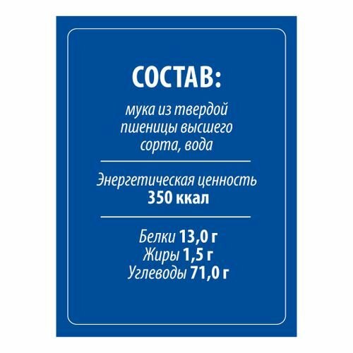 | Состав | мука из твердой пшеницы для макаронных изделий высшего сорта, вода питьевая |