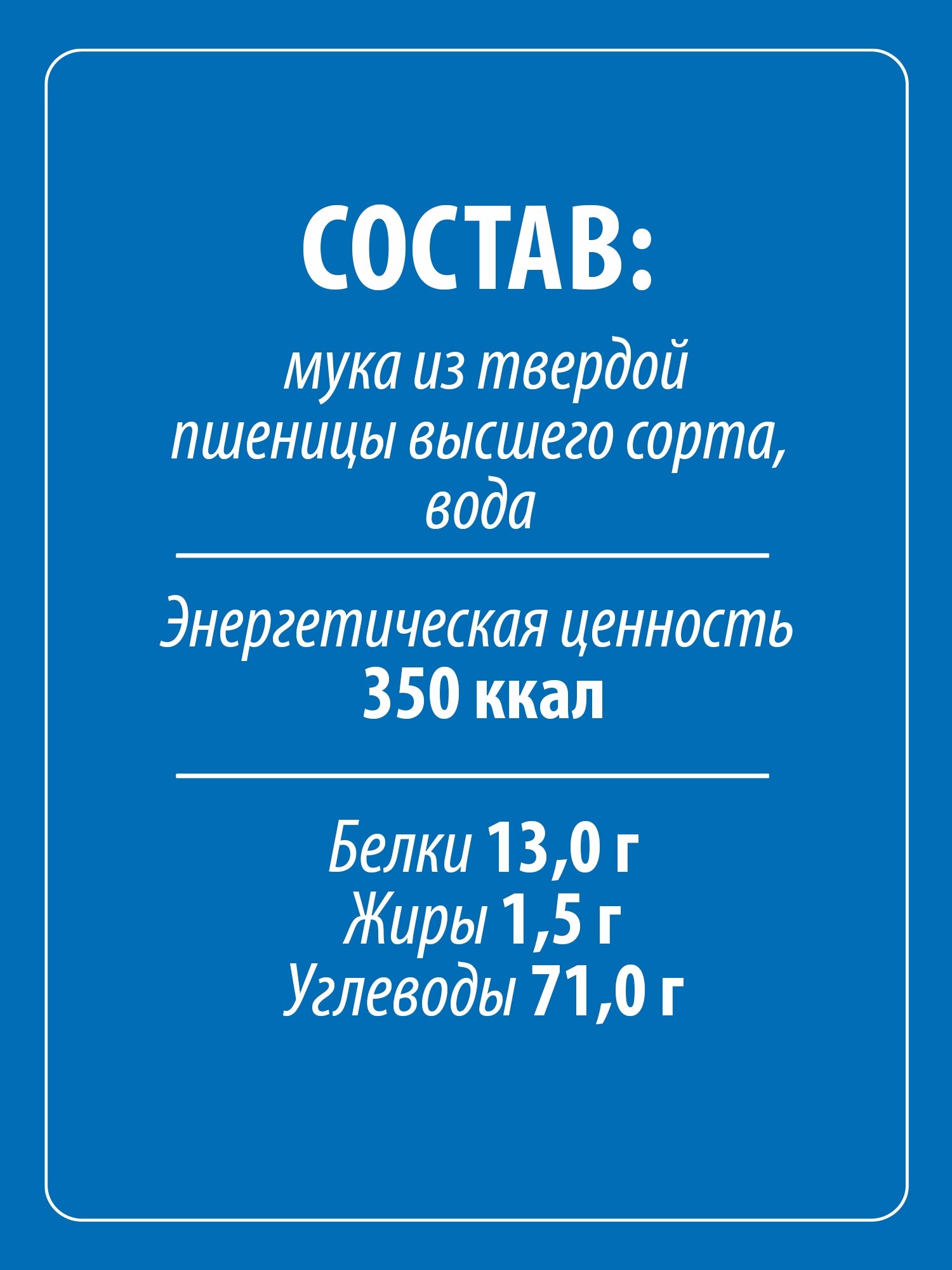 | Состав | мука из твердых сортов пшеницы для макаронных изделий высшего сорта, вода питьевая |