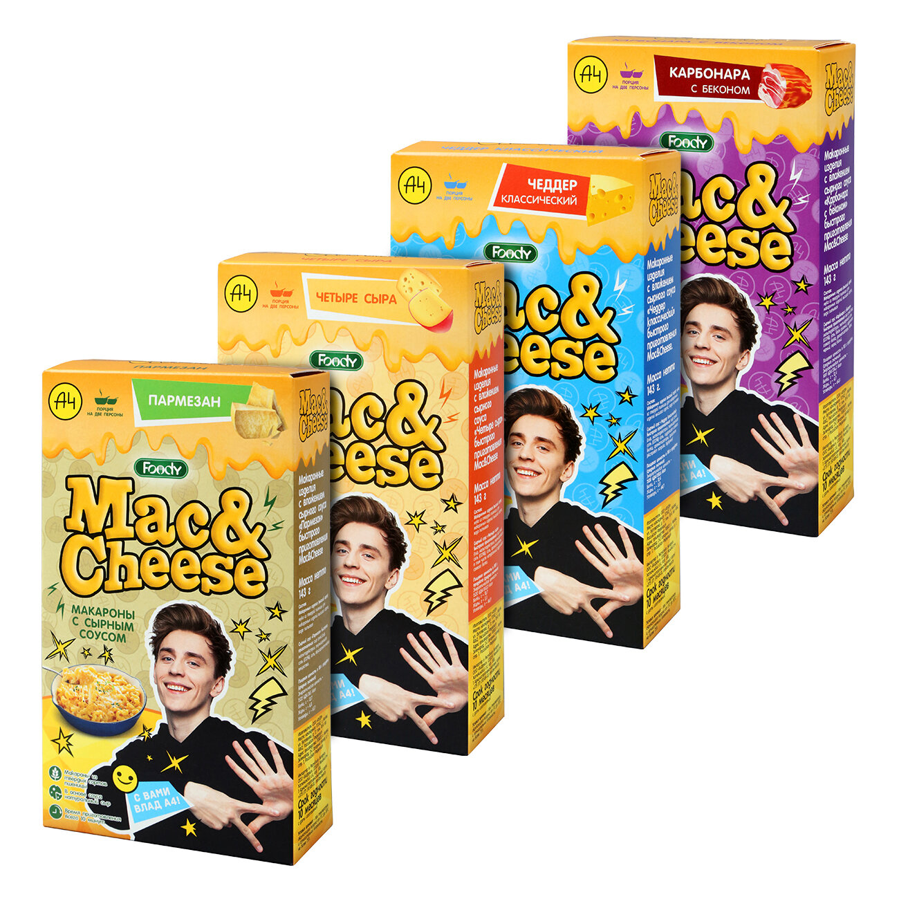 Купить Макароны с сырным соусом Foody Mac&Cheese Ассорти вкусов (пармезан, чеддер, карбонара, четыре сыра), 4шт по 143г