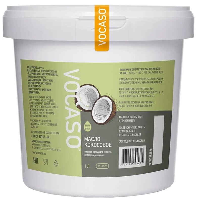 Кокосовое масло VOCASO (1 л) холодного отжима, нерафинированное. ГОСТ 10766-64 интересное: