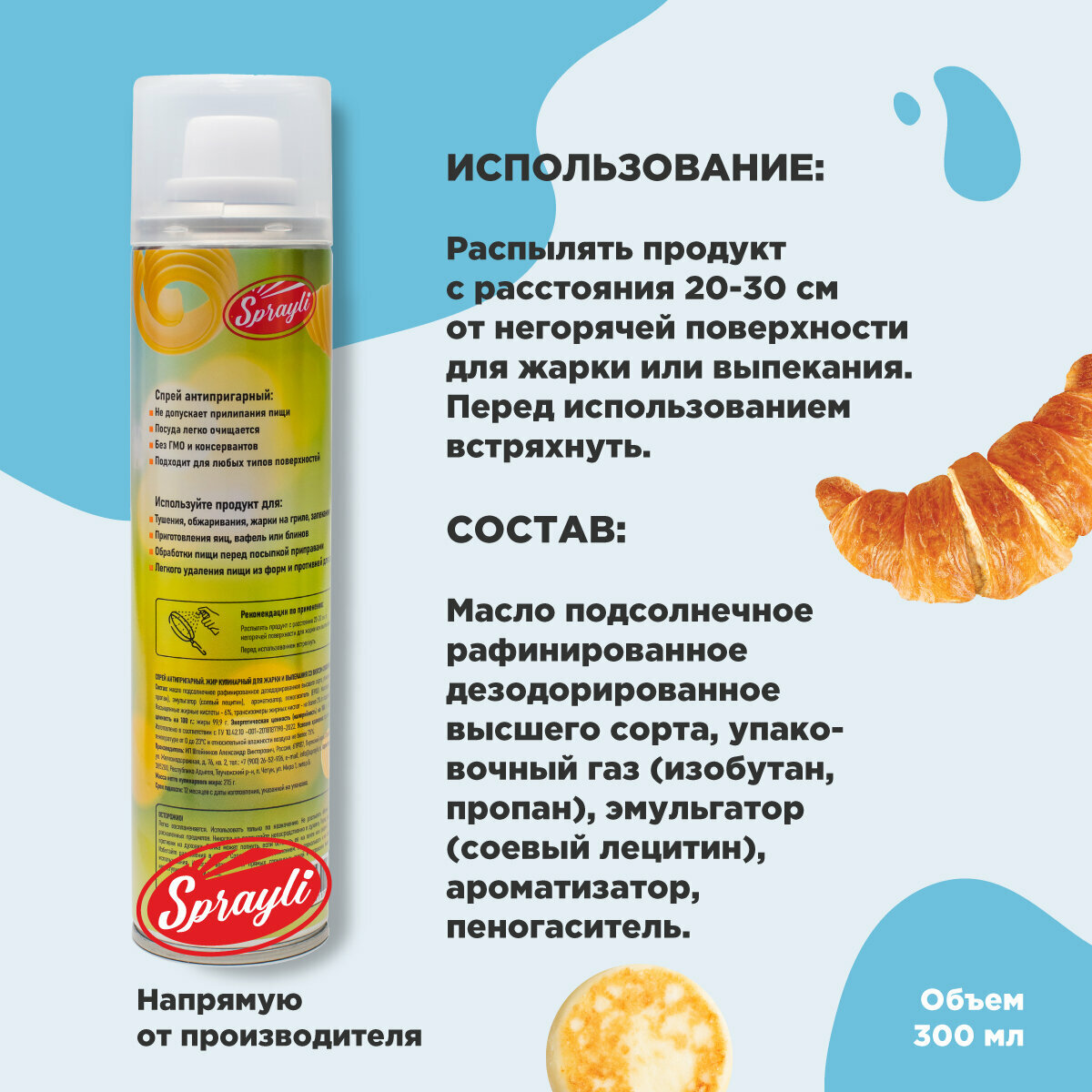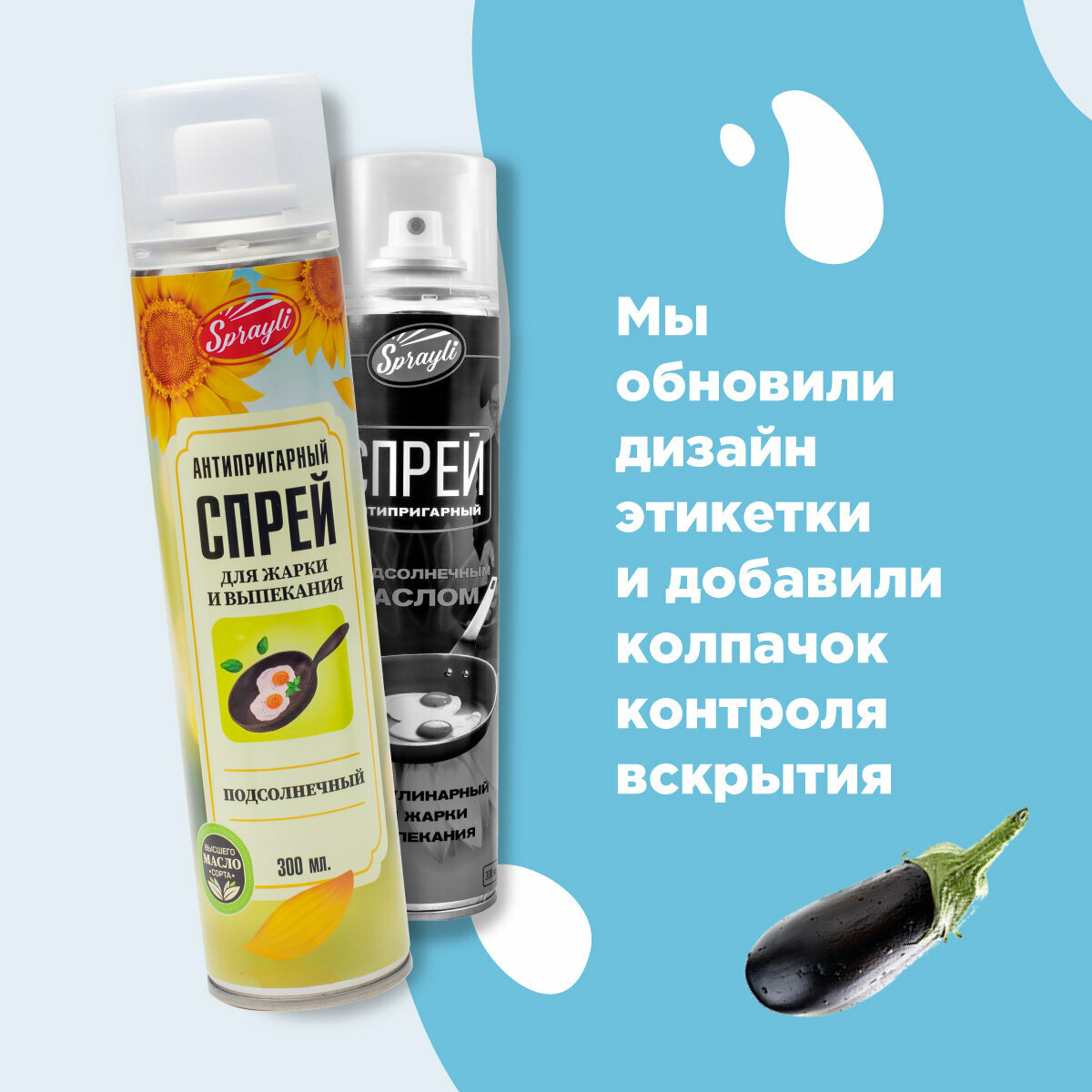 СохранитьАнтипригарный оливковый, подсолнечный и со вкусом сливочного масла спрей для жарки и выпекания Sprayli интересное: