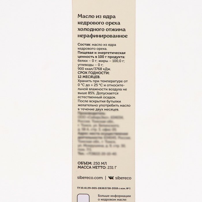 Масло кедрового ореха SIBERECO холодного отжима, 0.25 л интересное: