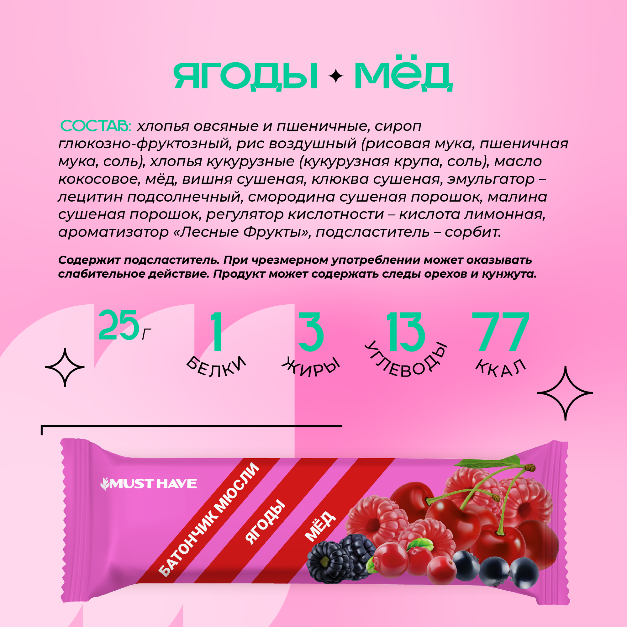 Батончик мюсли MustHave "Ягоды и мёд" 25г (25шт)