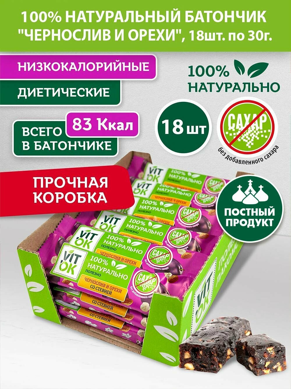 Ниже Вы можете прочитать отзывы на Батончик Vitok полезный 100% натуральный неглазированный Чернослив и орехи без сахара, 18 шт по 30 г, ознакомится с подробными характеристиками, посмотреть интересные обзоры и фотографии на Батончик Vitok полезный 100% натуральный неглазированный Чернослив и орехи без сахара, 18 шт по 30 г.