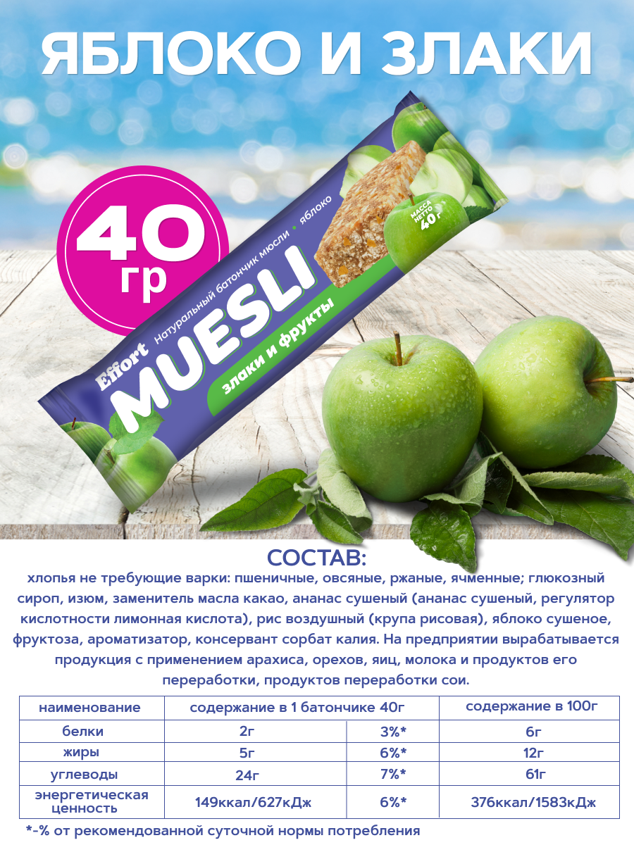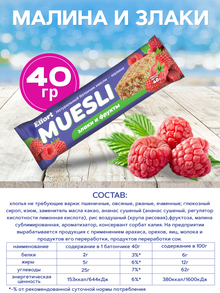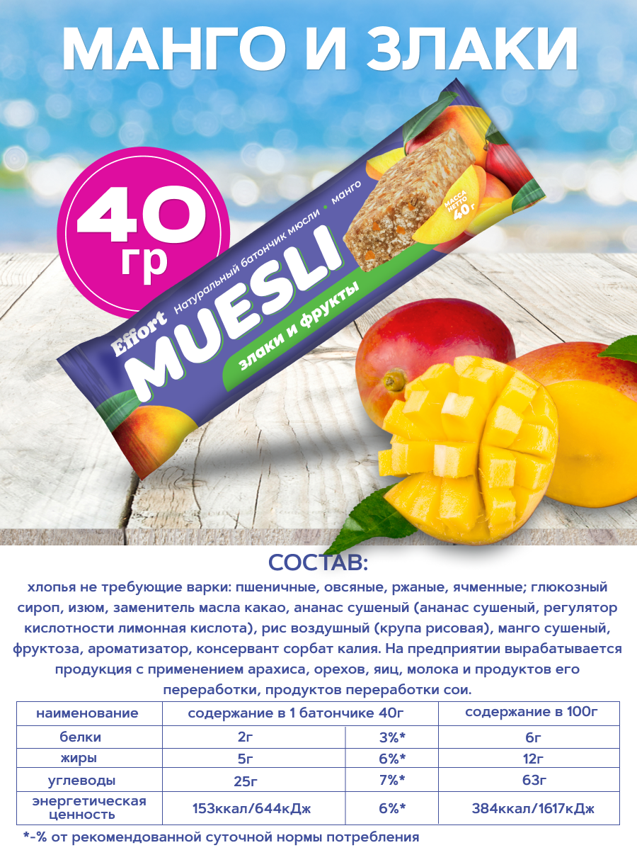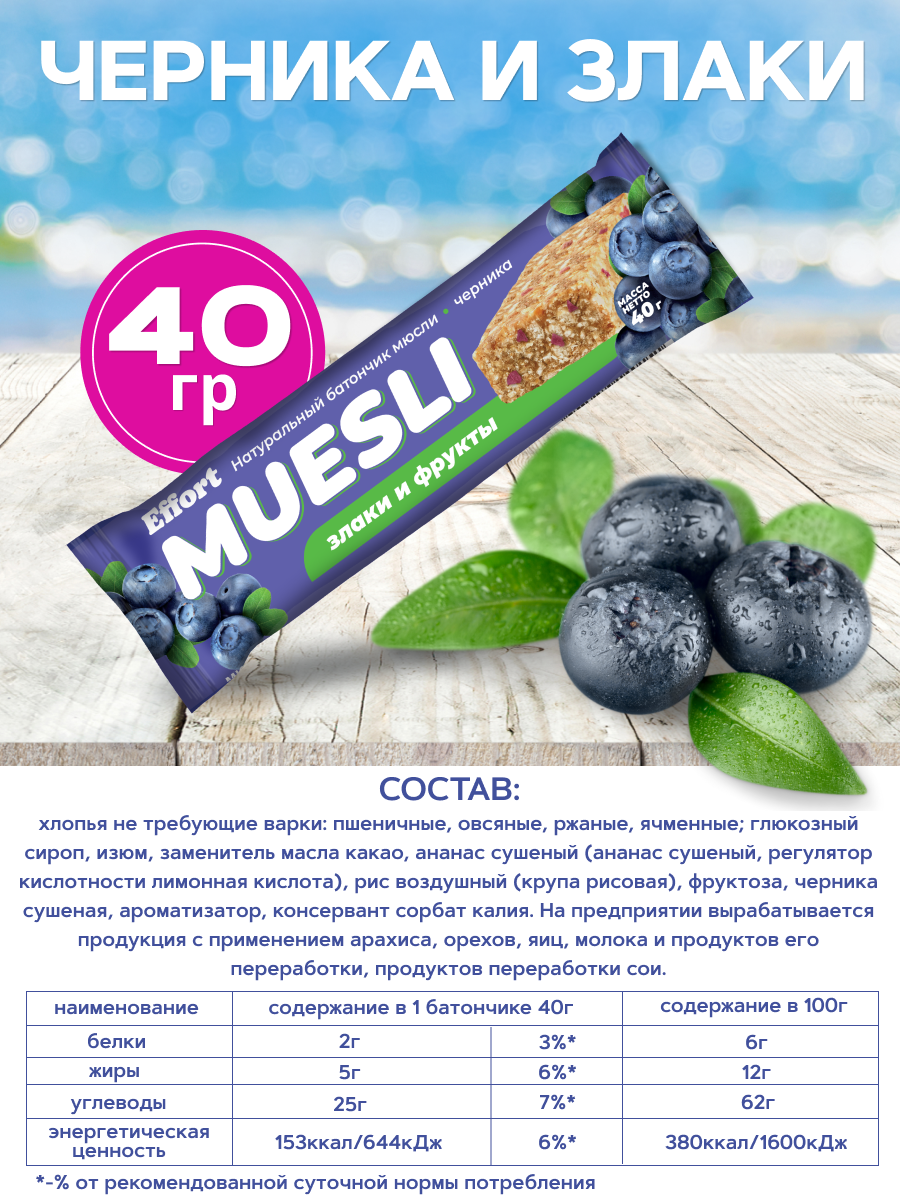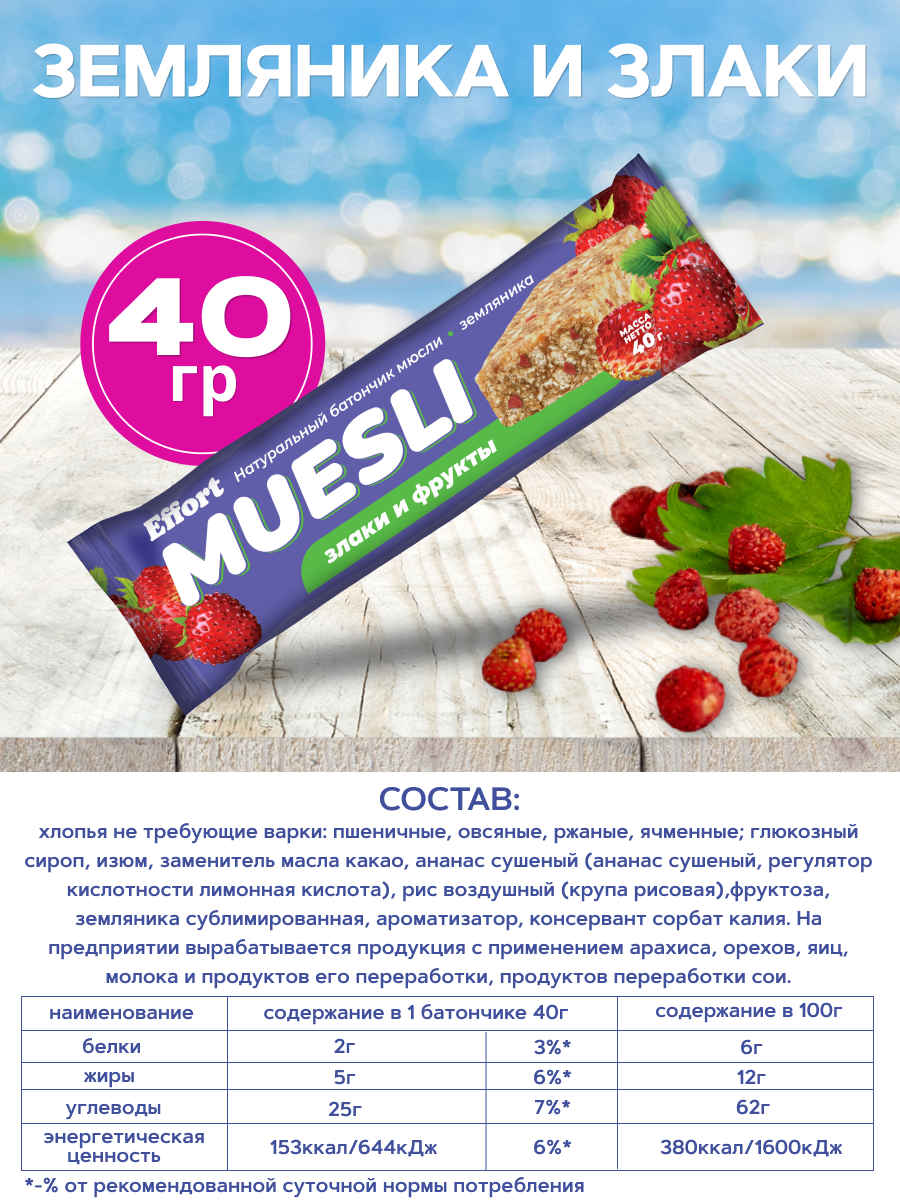 Батончики мюсли злаковые Effort без сахара ассорти: земляника, малина, манго, черника, яблоко и злаки, 20 шт по 40 гр интересное: