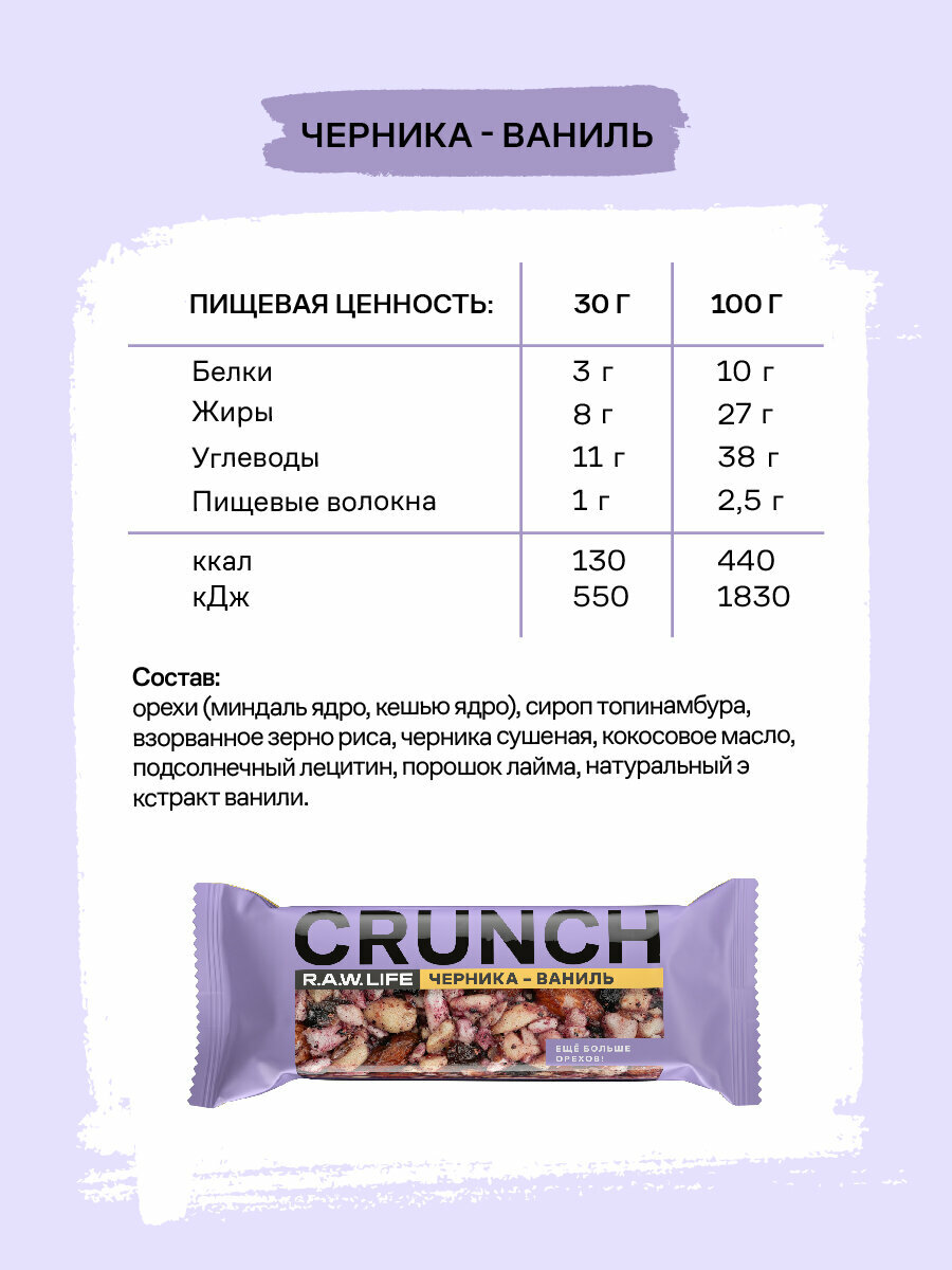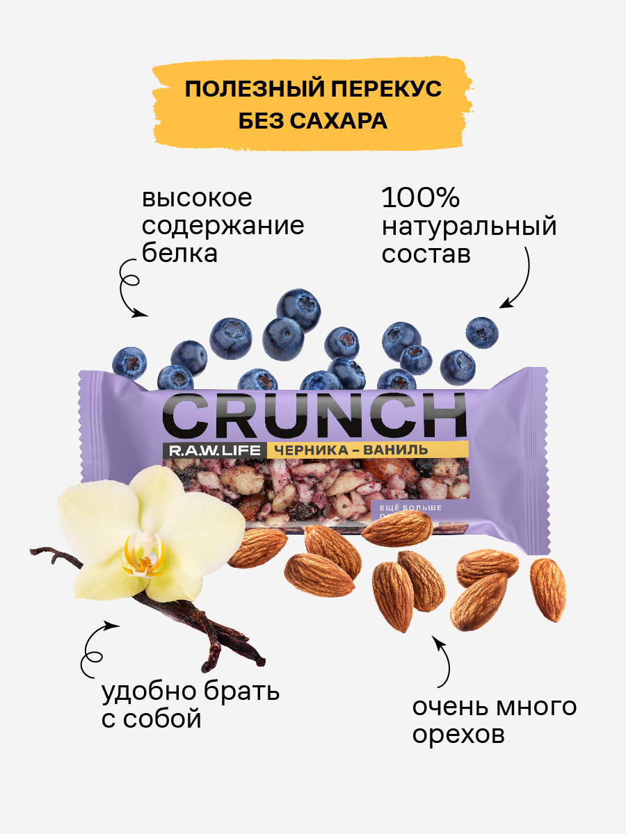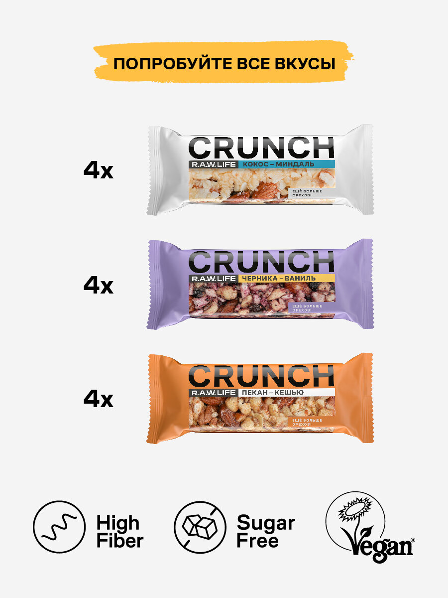 Энергетические батончики без сахара R.A.W.LIFE CRUNCH / Злаковые, натуральные, много орехов / Ассорти 12 шт по 30 гр