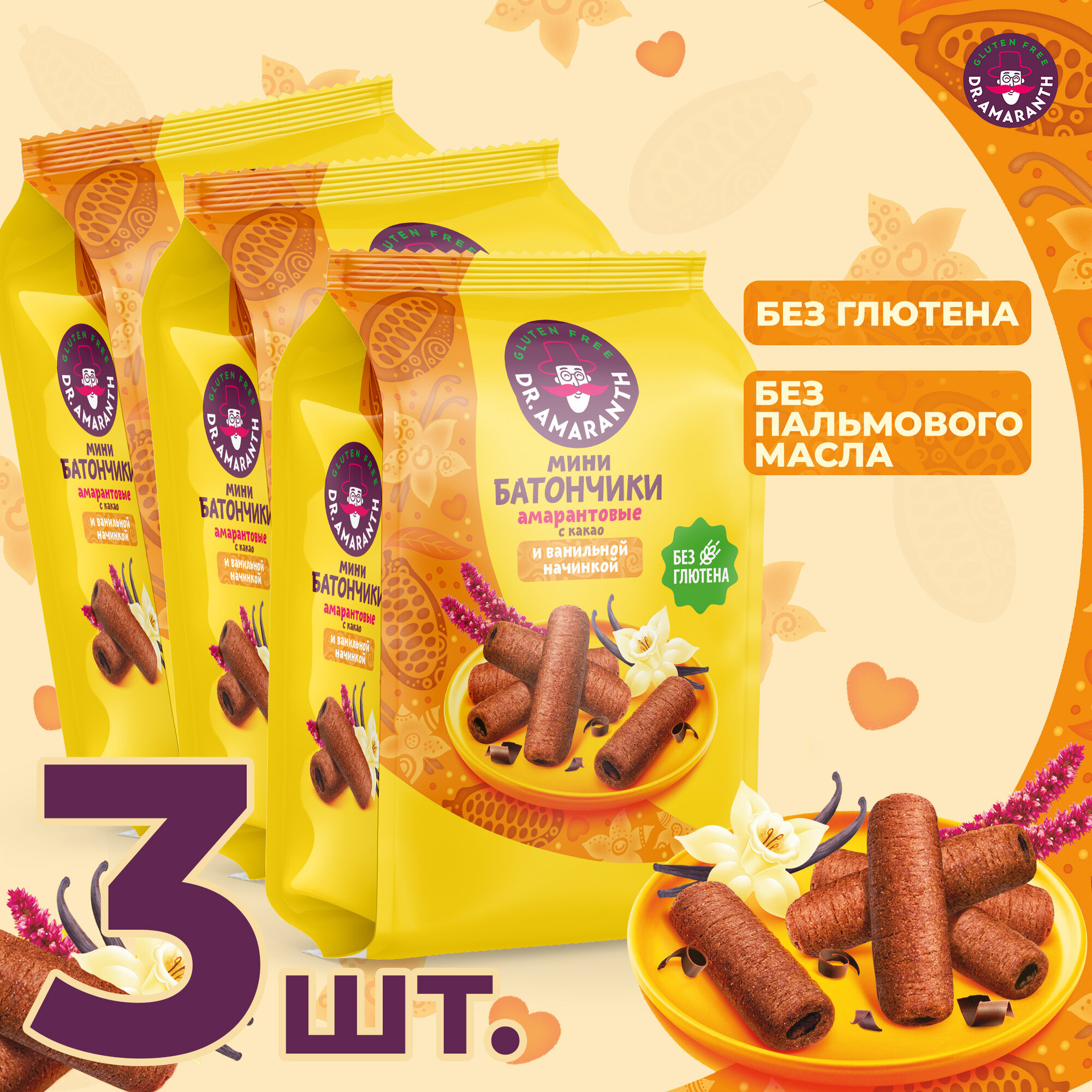 Мини-батончики без глютена "DR.AMARANTH" с какао и ванильной начинкой, 3шт по 100г интересное: