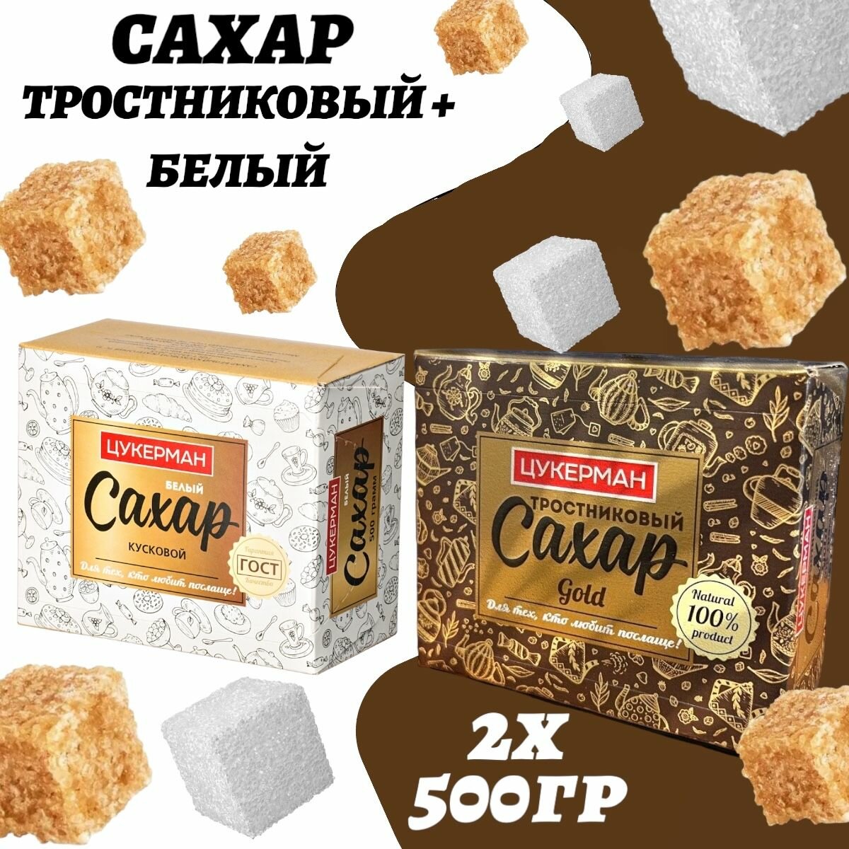 Купить Белый и Тростниковый Сахар в кубиках, 2шт по 500гр