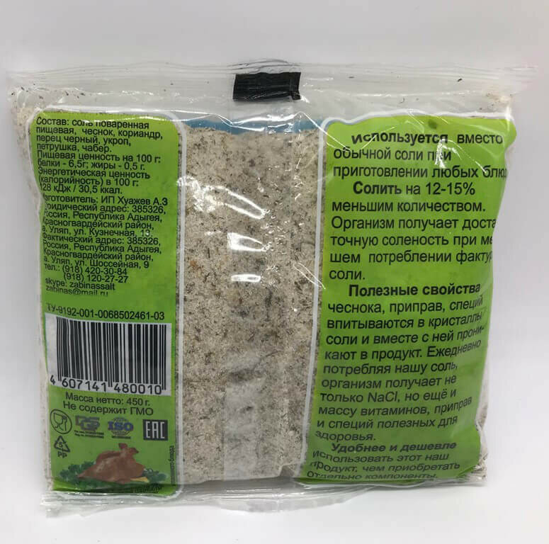 | Состав | Соль поваренная пищевая , чеснок, кориандр, перец черный, чабер, укроп, петрушка. |
