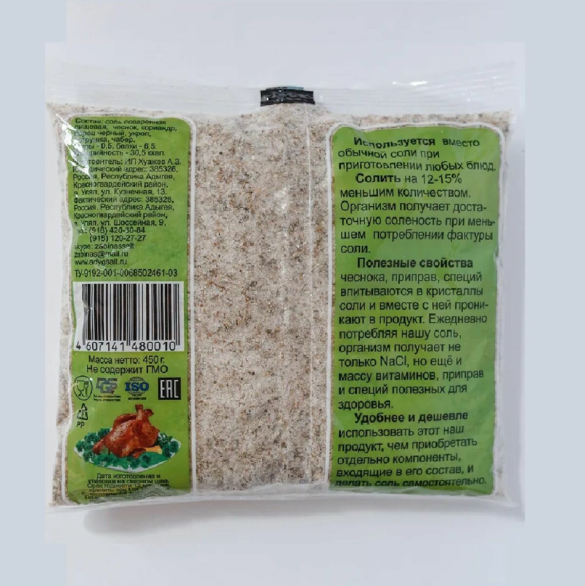 | Состав | Соль поваренная пищевая , чеснок, кориандр, перец черный, чабер,укроп,петрушка. |