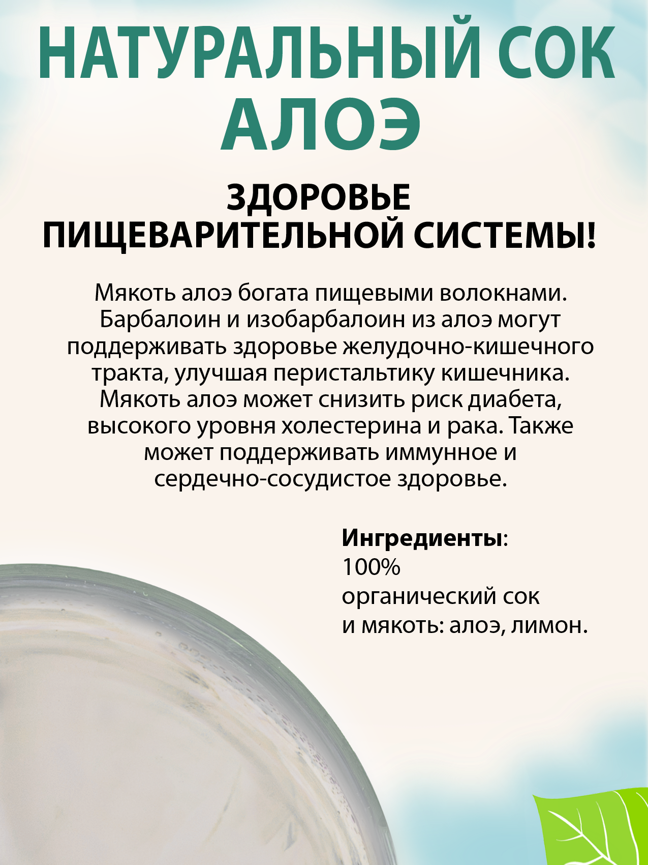 | Состав | 100% органический сок и мякоть: алоэ 99%, лимон 1%. Не восстановлен из концентрата |