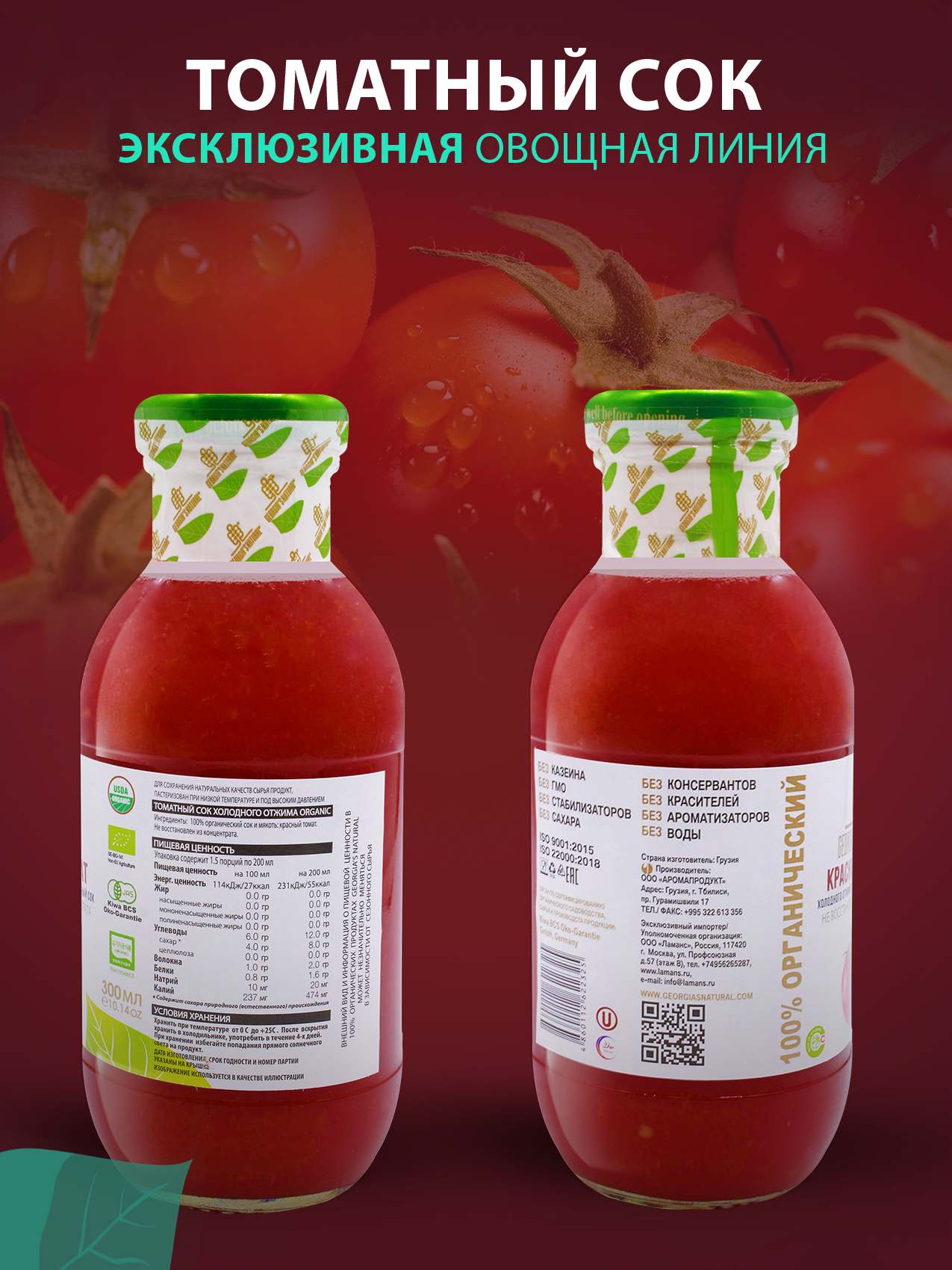| Состав | 100% органический сок и мякоть: красный томат. Не восстановлен из концентрата. |