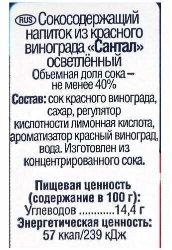 | Состав | вода, сахар, концентрированный сок красного винограда, подкислитель - лимонная кислота, ароматизатор идентичный натуральному красный виноград |