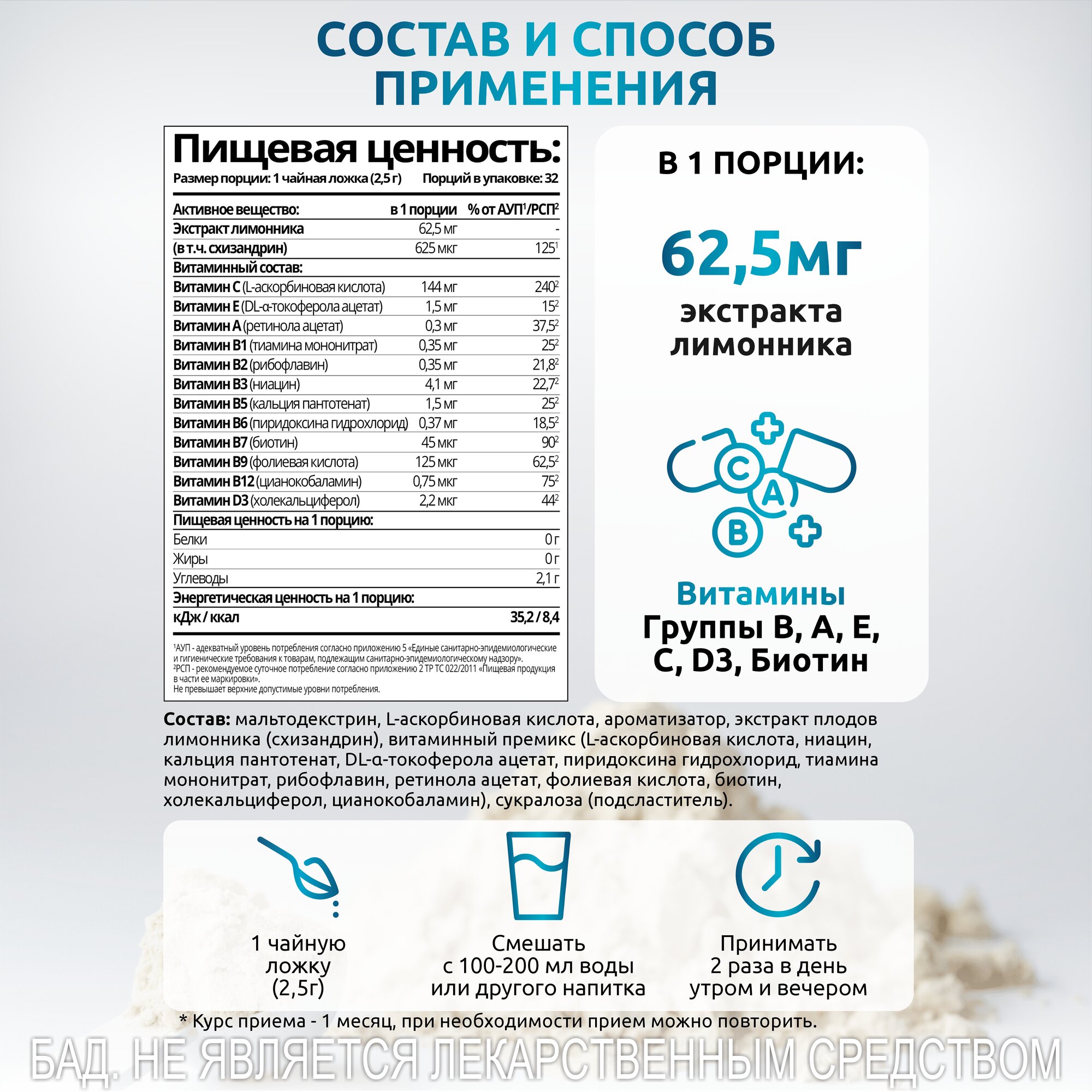 | Состав | мальтодекстрин, L-аскорбиновая кислота (витамин С), ароматизатор, экстракт плодов лимонника (схизандрин), витаминный премикс (L-аскорбиновая кислота, ниацин, кальция пантотенат, DL-α-токоферола ацетат, пиридоксина гидрохлорид, тиамина мононитрат, рибофлавин, ретинола ацетат, фолиевая кислота, биотин, холекальциферол, цианокобаламин), сукралоза (подсластитель). |