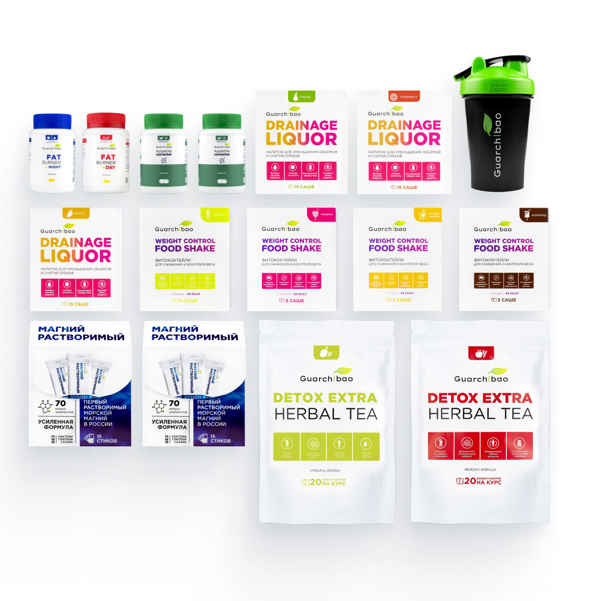 | Состав набора | В курс входят 8 позиций: капсулы жиросжигателя Fat Burner (2 банка, 60 капсул), фитококтейли для похудения Sachets (4 упаковки, 20 саше), дренажный напиток Drainage Liquor, детокс-чай Detox Herbal Tea |