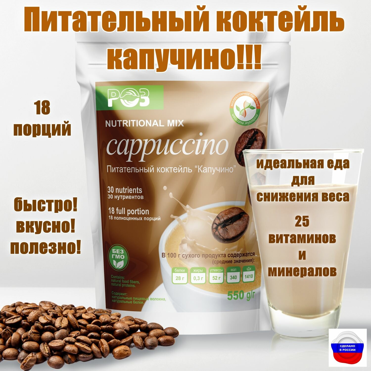 Питательный коктейль Капучино, Родник здоровья, низкокалорийный белковый, для похудения, протеиновый, с витаминами, с минералами интересное: