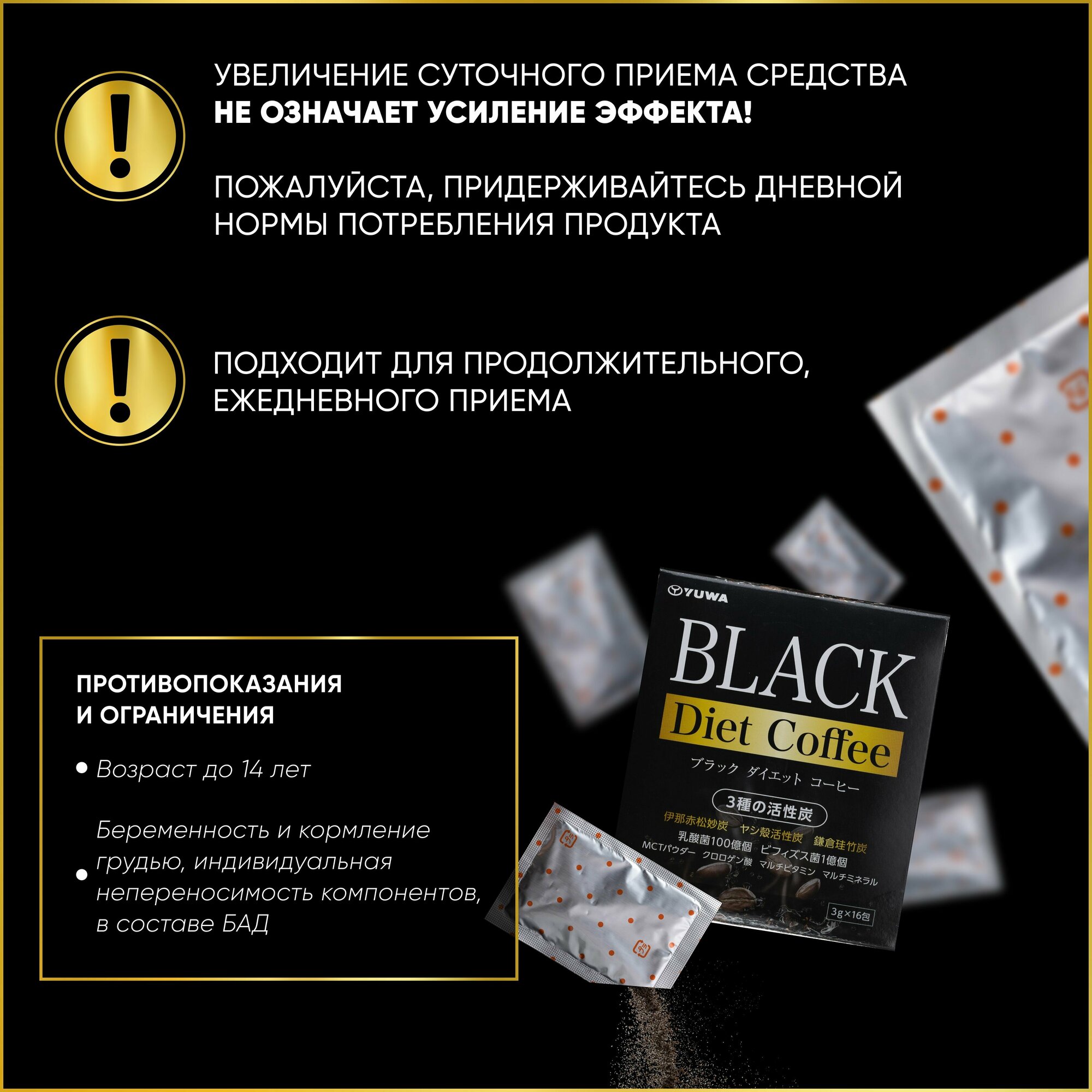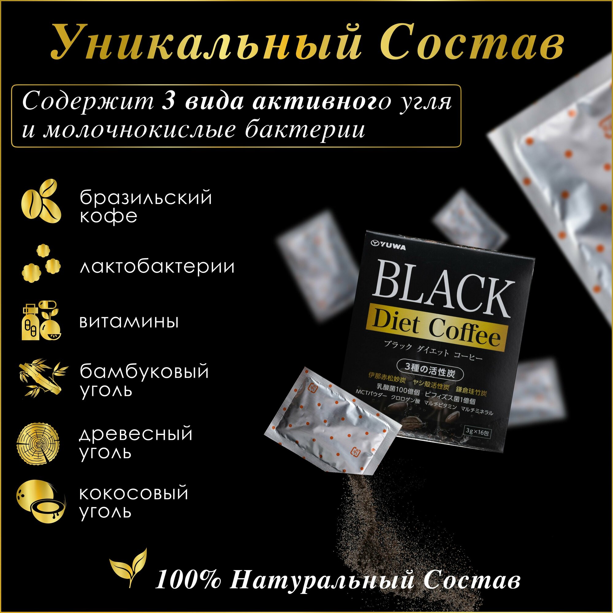 YUWA Черный кофе Япония DIET для контроля веса с тремя видами активированного угля и лактобактериями (16 шт.*3 гр.) интересное: