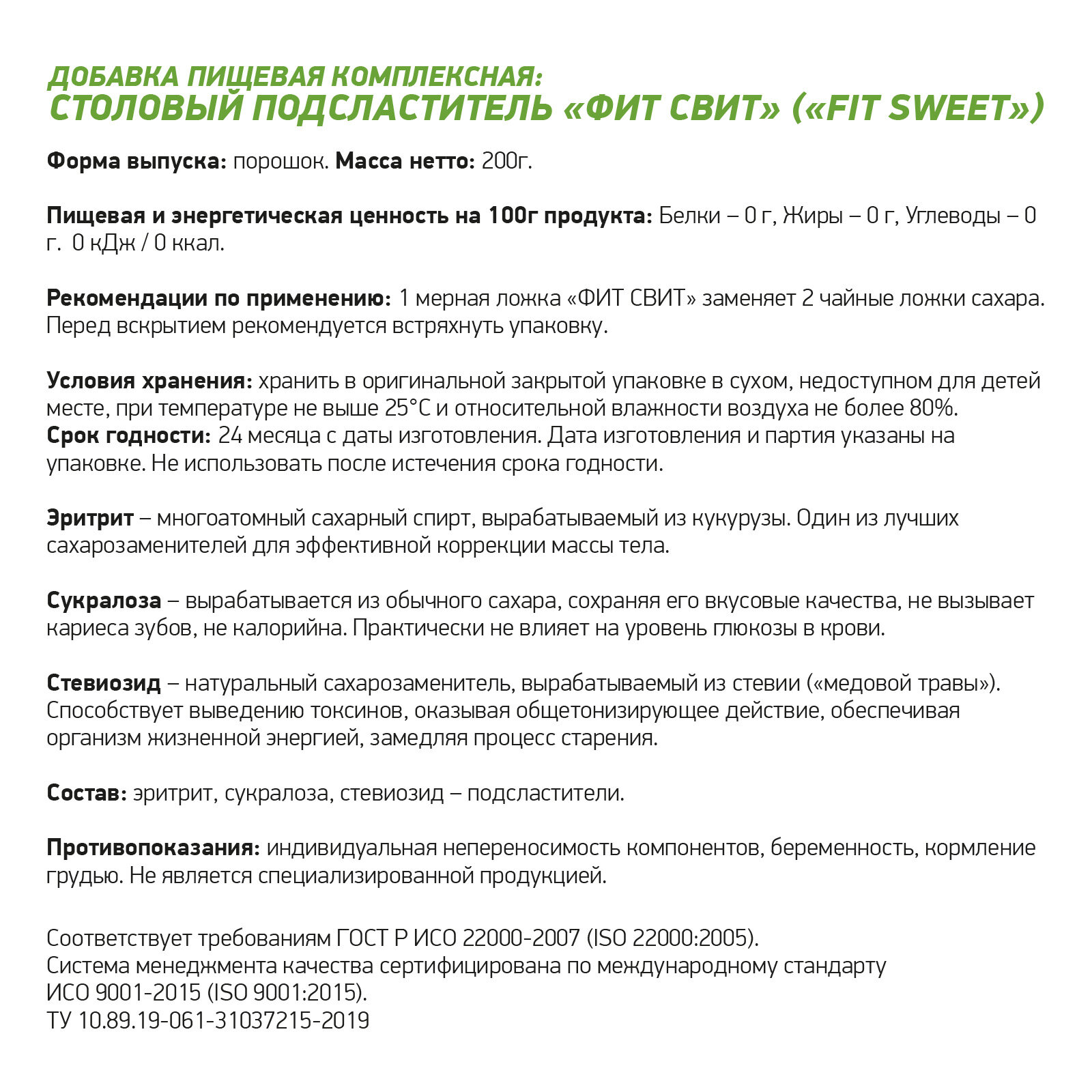 | Дополнительная информация | 1 мерная ложка FIT SWEET (Фит Свит) заменяет 2 чайные ложки сахара. Перед вскрытием встряхните упаковку. Подходит для диабетиков. |