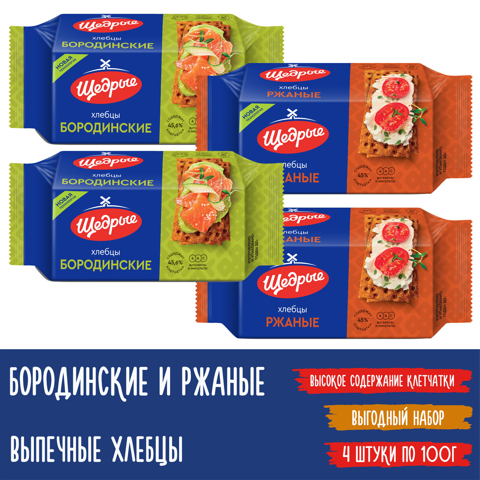 Купить Хлебцы Щедрые 2 вида: Бородинские и Ржаные, 4 штуки по 100г.