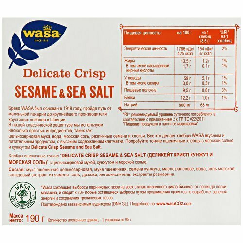 Хлебцы пшеничные Wasa Delicate Crisp с кунжутом-морской солью 190 г интересное:
