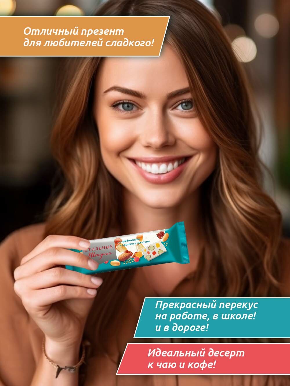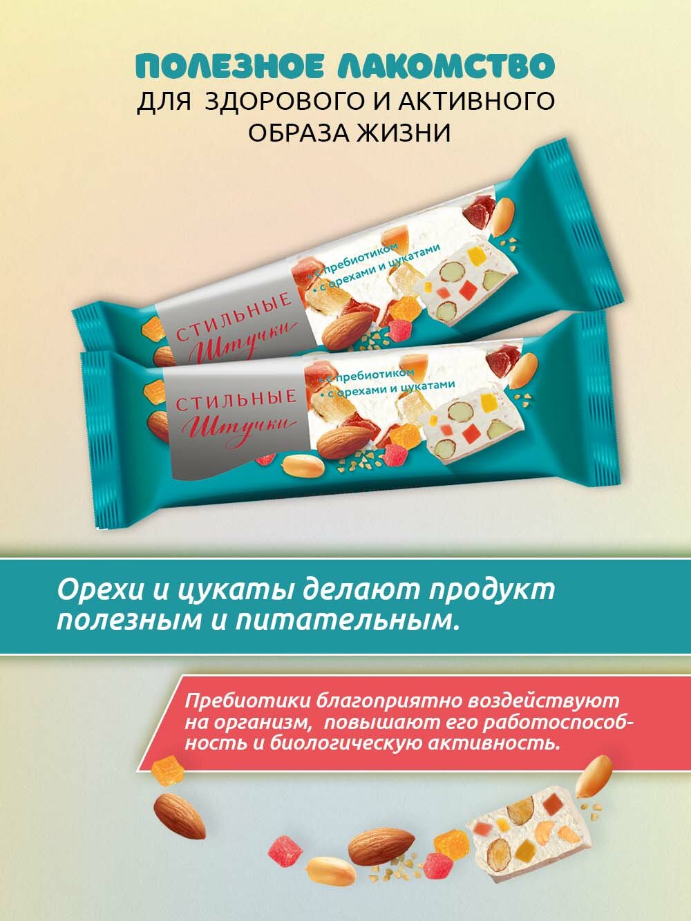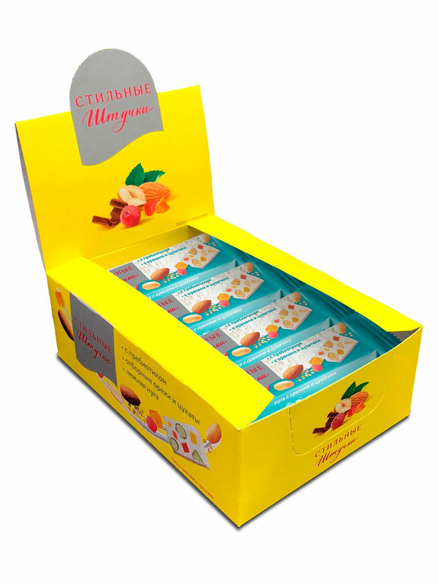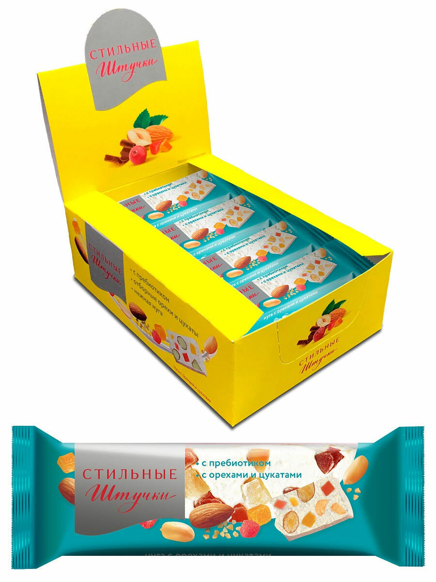 Батончик/конфеты "Стильные штучки" Нуга с орехами и цукатами/ конфета с нугой/ конфетами с орехами и нугой/ батончик с нугой/ батончик на основе нуги/ перекус 60 г , 12 шт в шоу-боксе интересное: