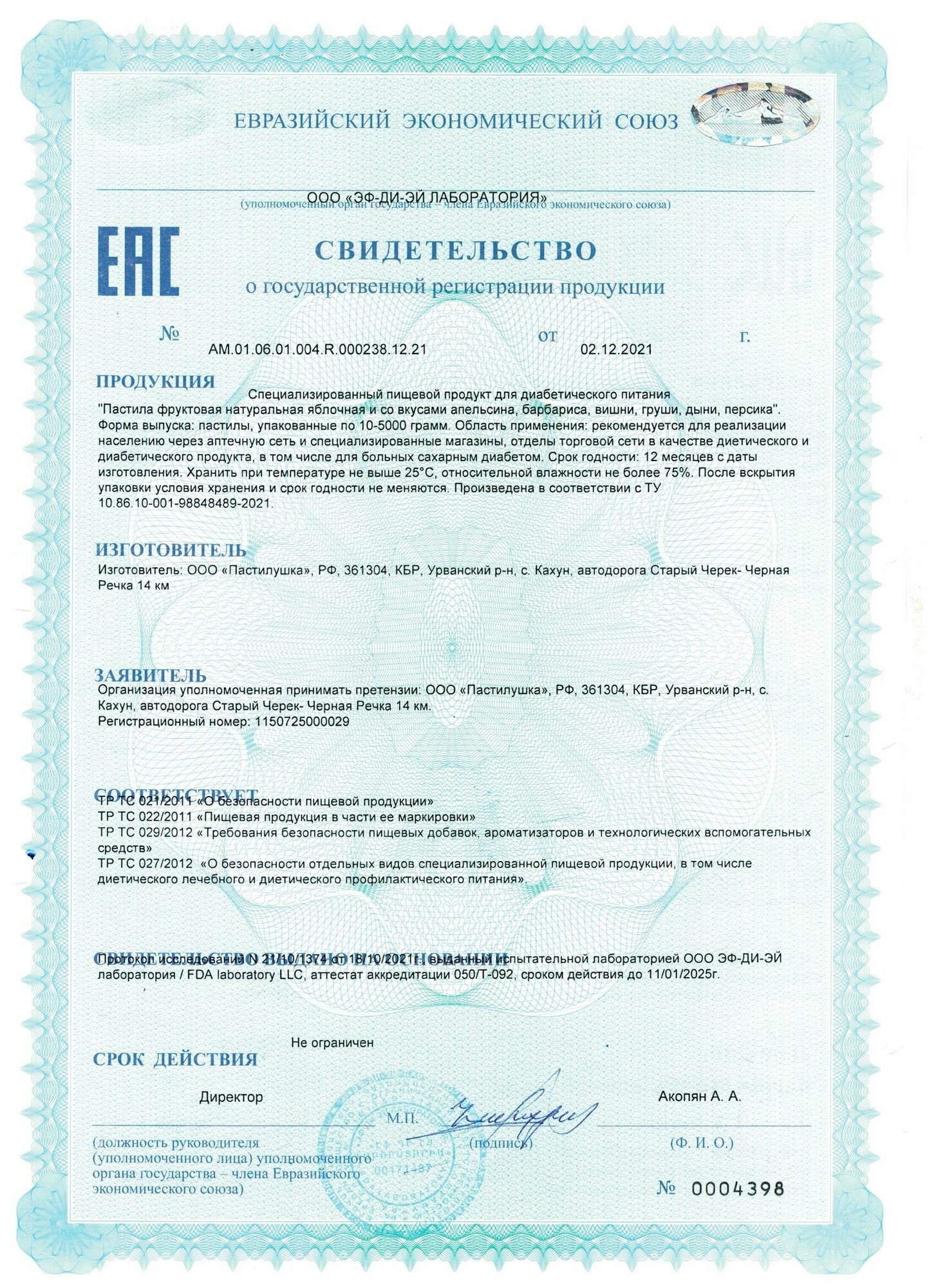 | Стандарты производства | ТУ 10.86.10-004-98840233-2018 |